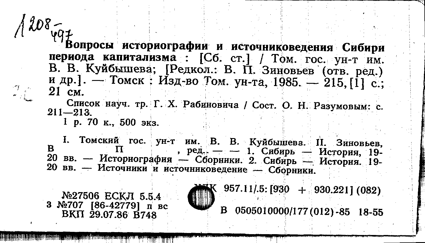 Книга: Вопросы историографии и источниковедения Сибири периода капитализма