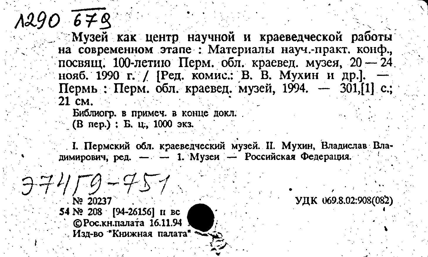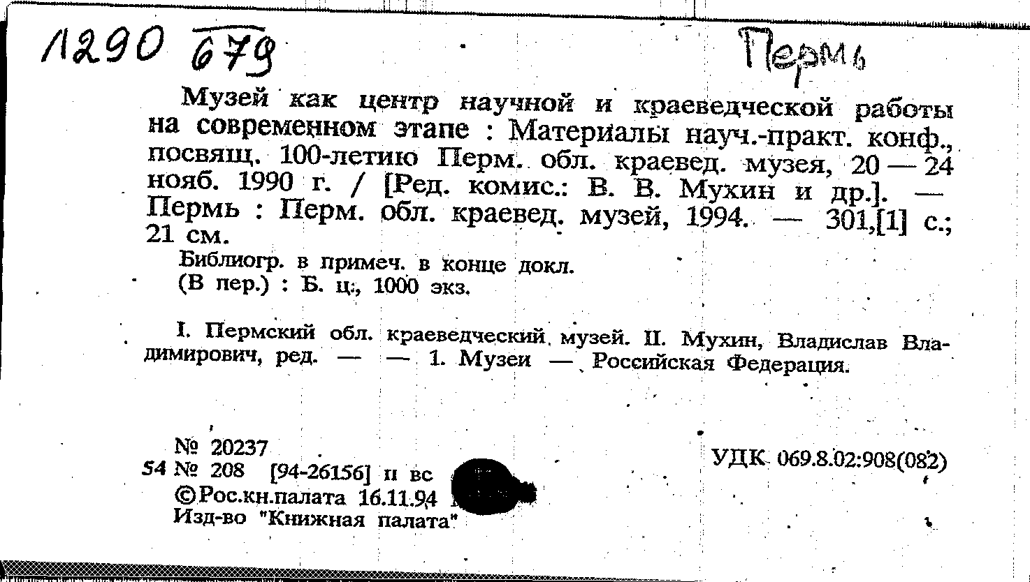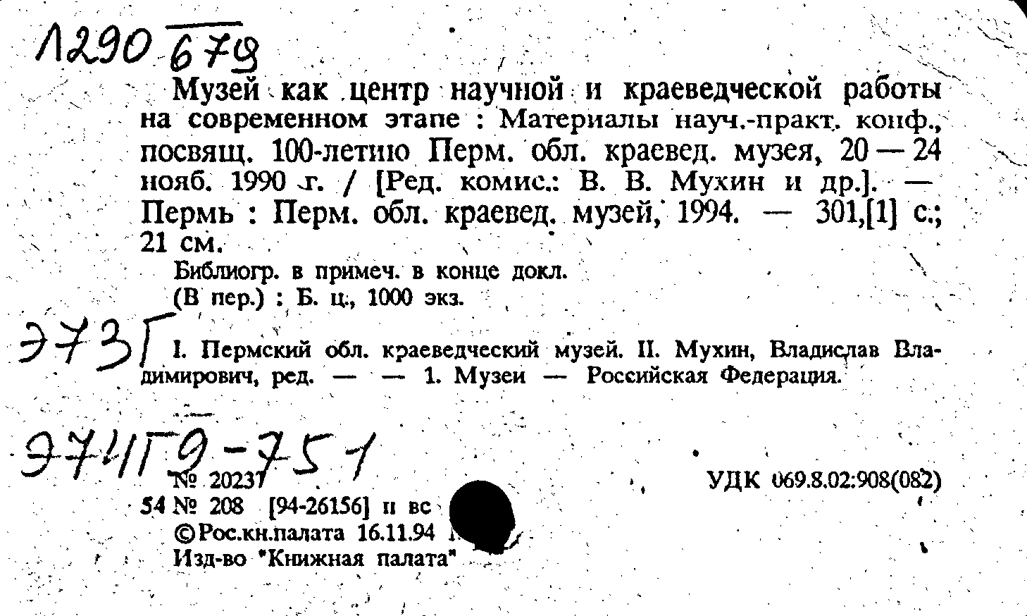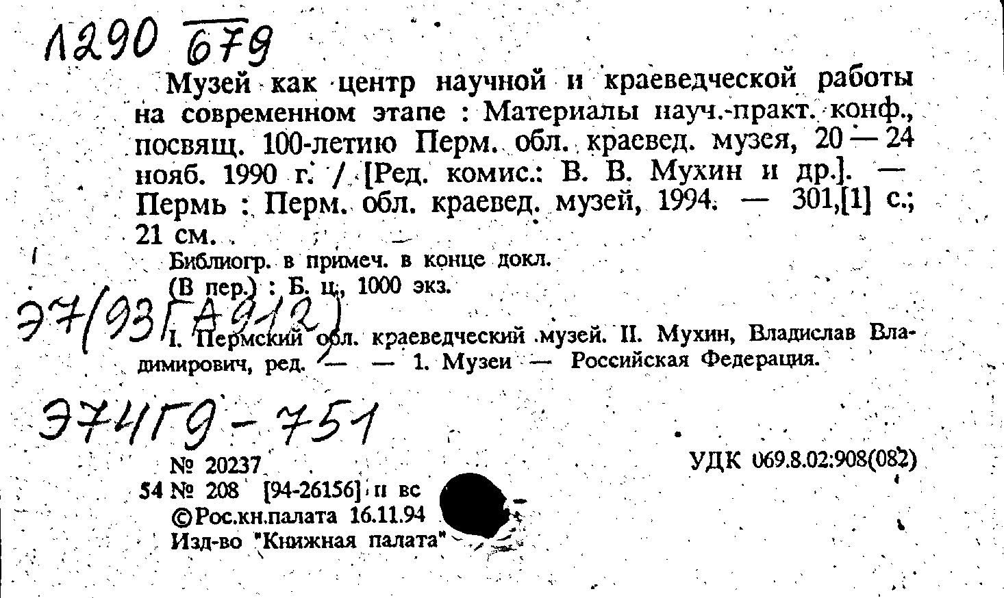 Музей как центр научной и краеведческой работы на современном этапе: материалы научно-практической конференции, посвященной 100-летию Пермского областного краеведческого музея, 20 - 24 ноября 1990 г.