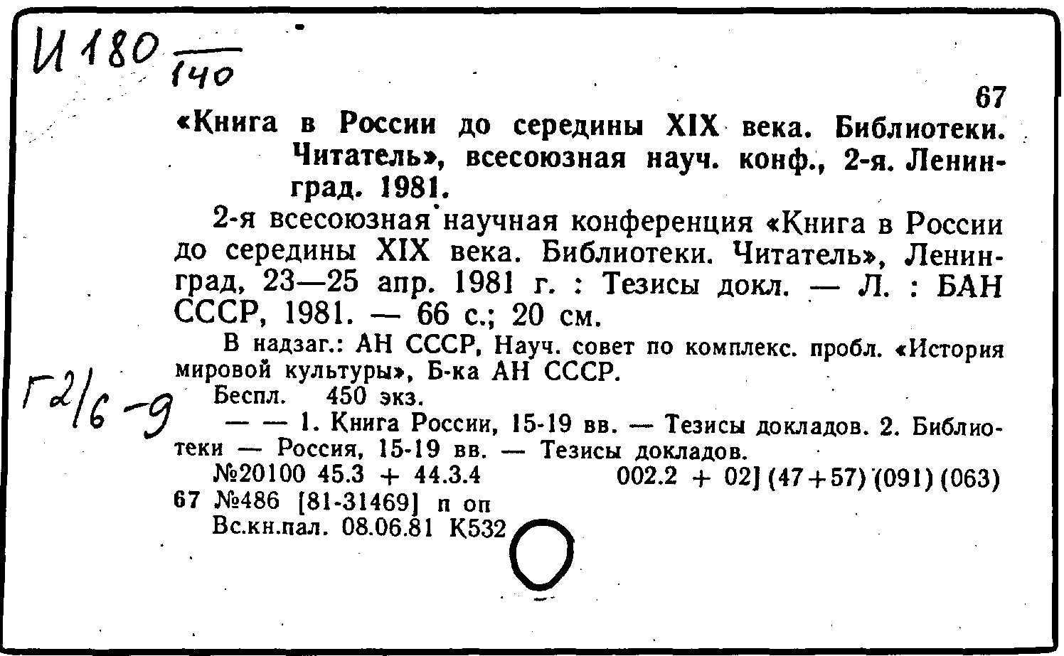 "Книга в России до середины XIX века. Библиотеки. Читатель", всесоюзная науч. конф. (2; 1981; Ленинград)