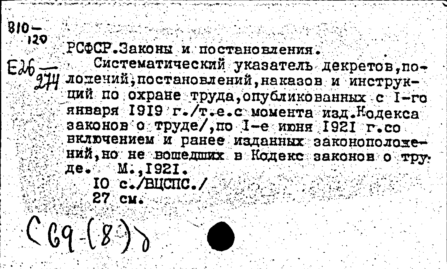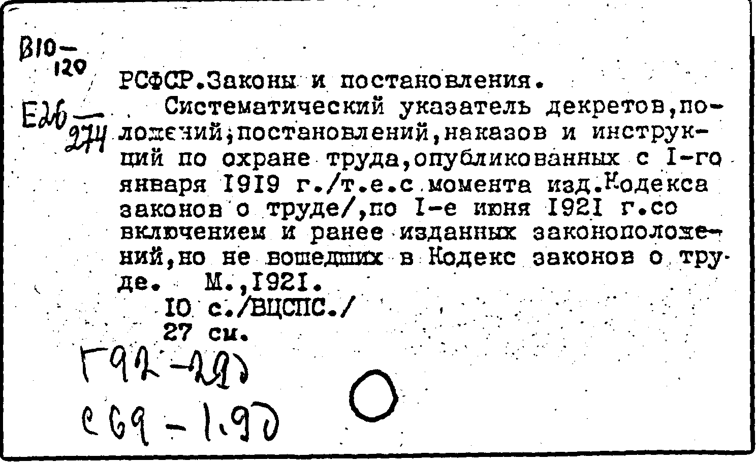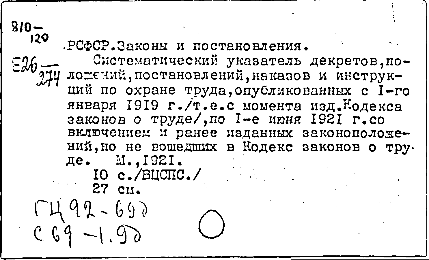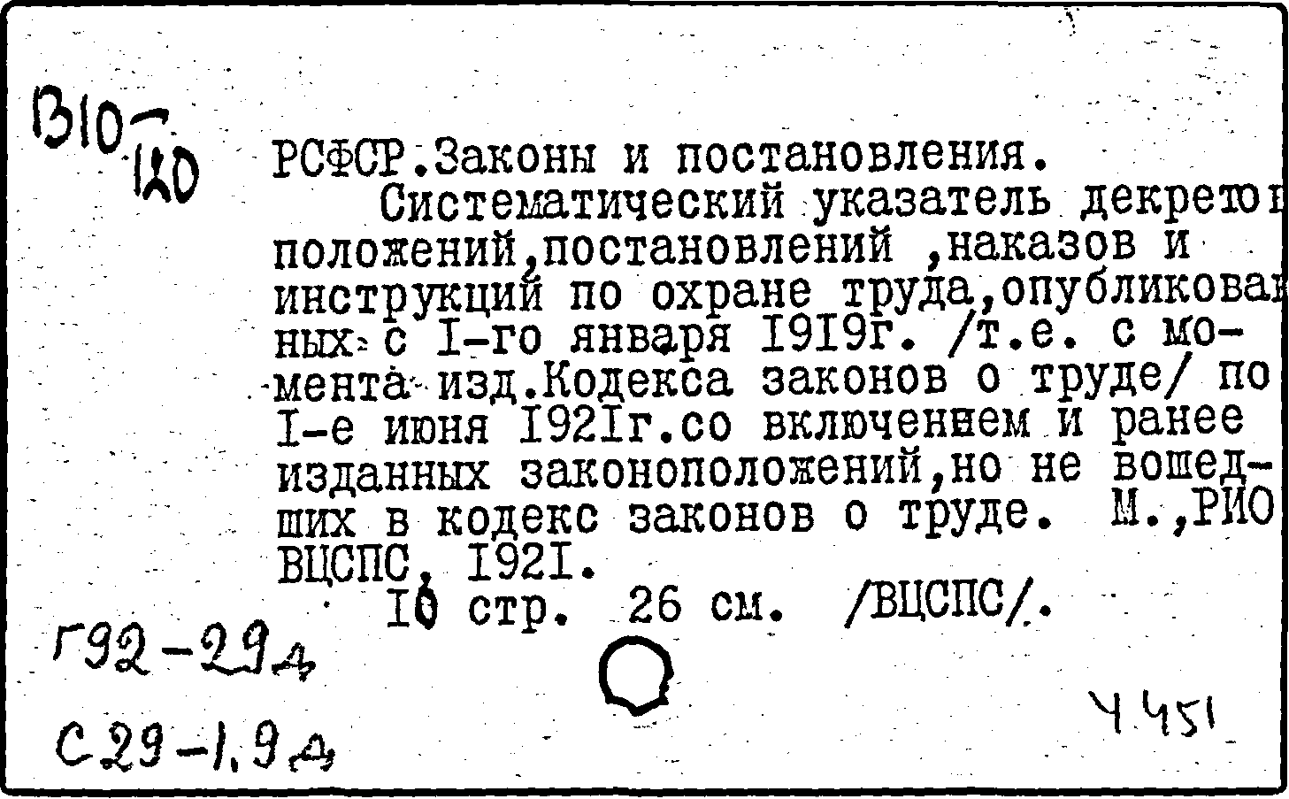 Систематический указатель декретов, положений, постановлений, наказов и инструкций по охране труда, опубликованных с 1-го января 1919 г. [т. е. с момента издания Кодекса законов о труде] по 1-е июня 1921 г. со включением и ранее изданных законоположений, но не вошедших в кодекс законов о труде