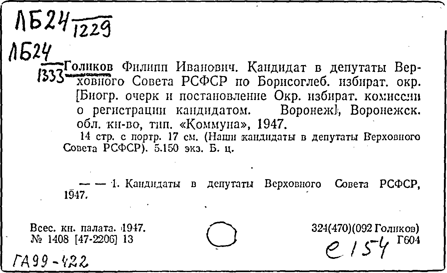 Голиков Филипп Иванович : кандидат в депутаты Верховного Совета РСФСР по Борисоглебскому избирательному округу,[биографический очерк и постановление Окружной избирательной комиссии о регистрации кандидатом] - Во