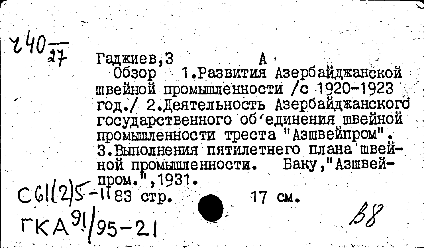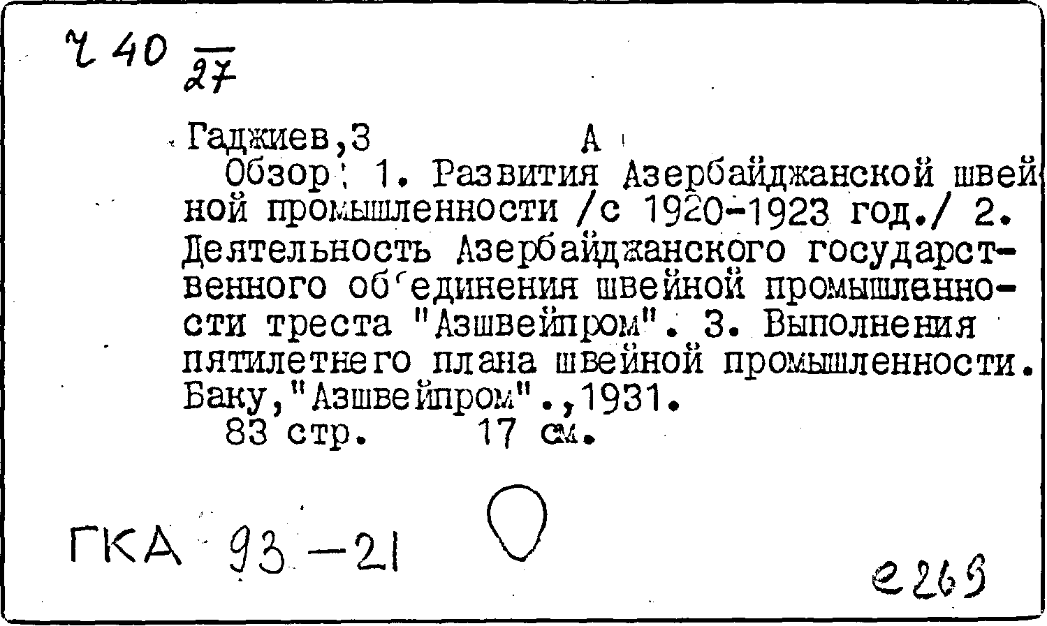 Обзор: 1. Развития Азербайджанской промышленности (с 1920-1923 гг.). 2. Деятельность Азербайджанского государственного объединения швейной промышленности треста "Азшвейпром". 3. Выполнения пятилетнего плана швейной промышленности