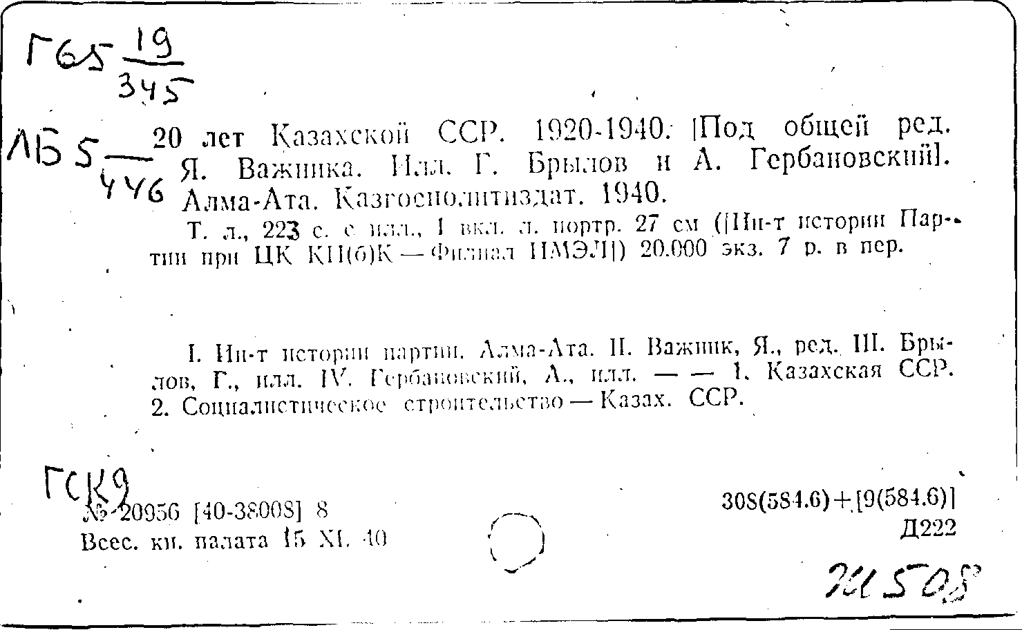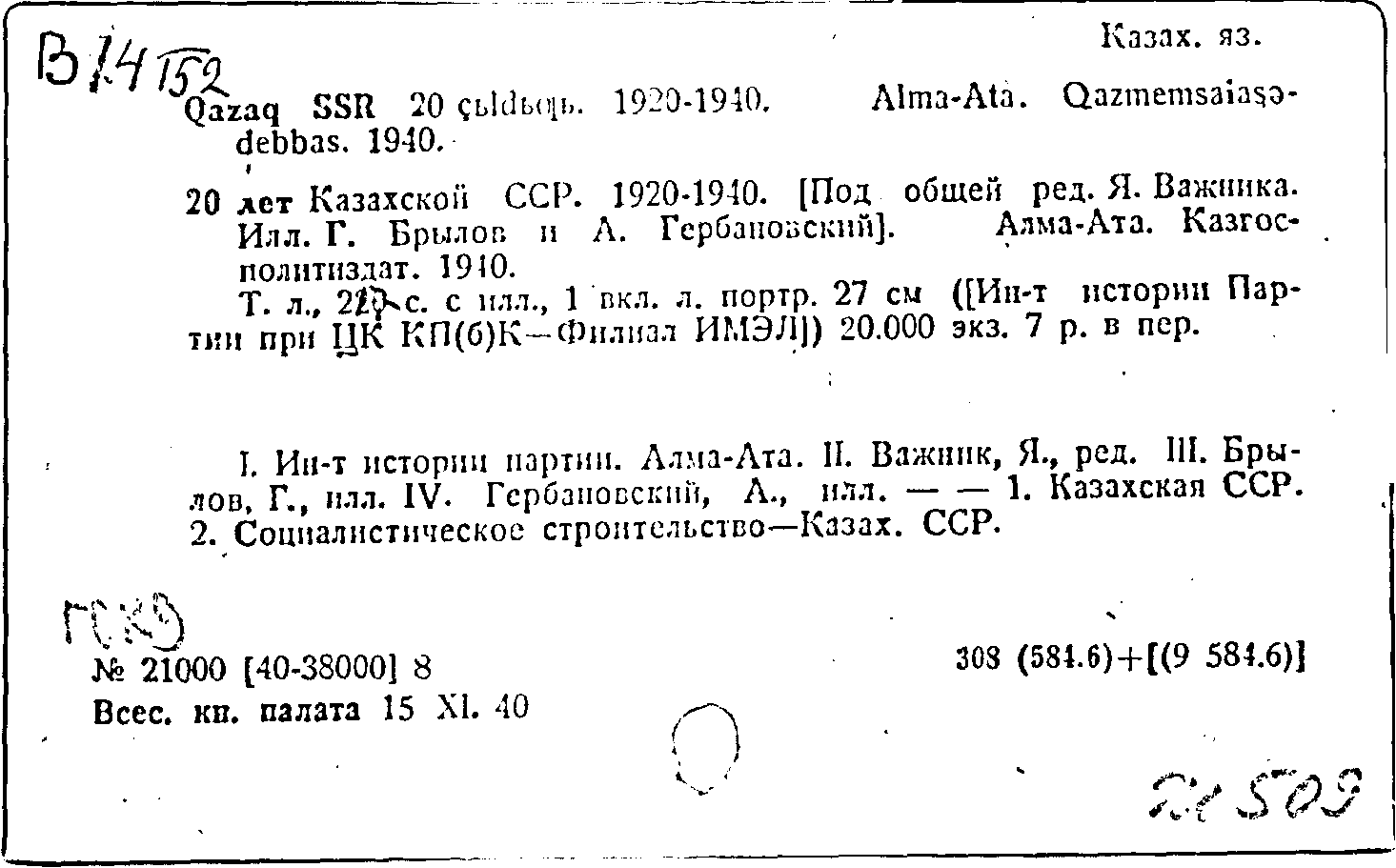 редактор Важник Я., рис. Брылов Георгий Александрович, Гербановский А., Институт истории партии при ЦК КП(б) Казахстана - филиал ИМЭЛ