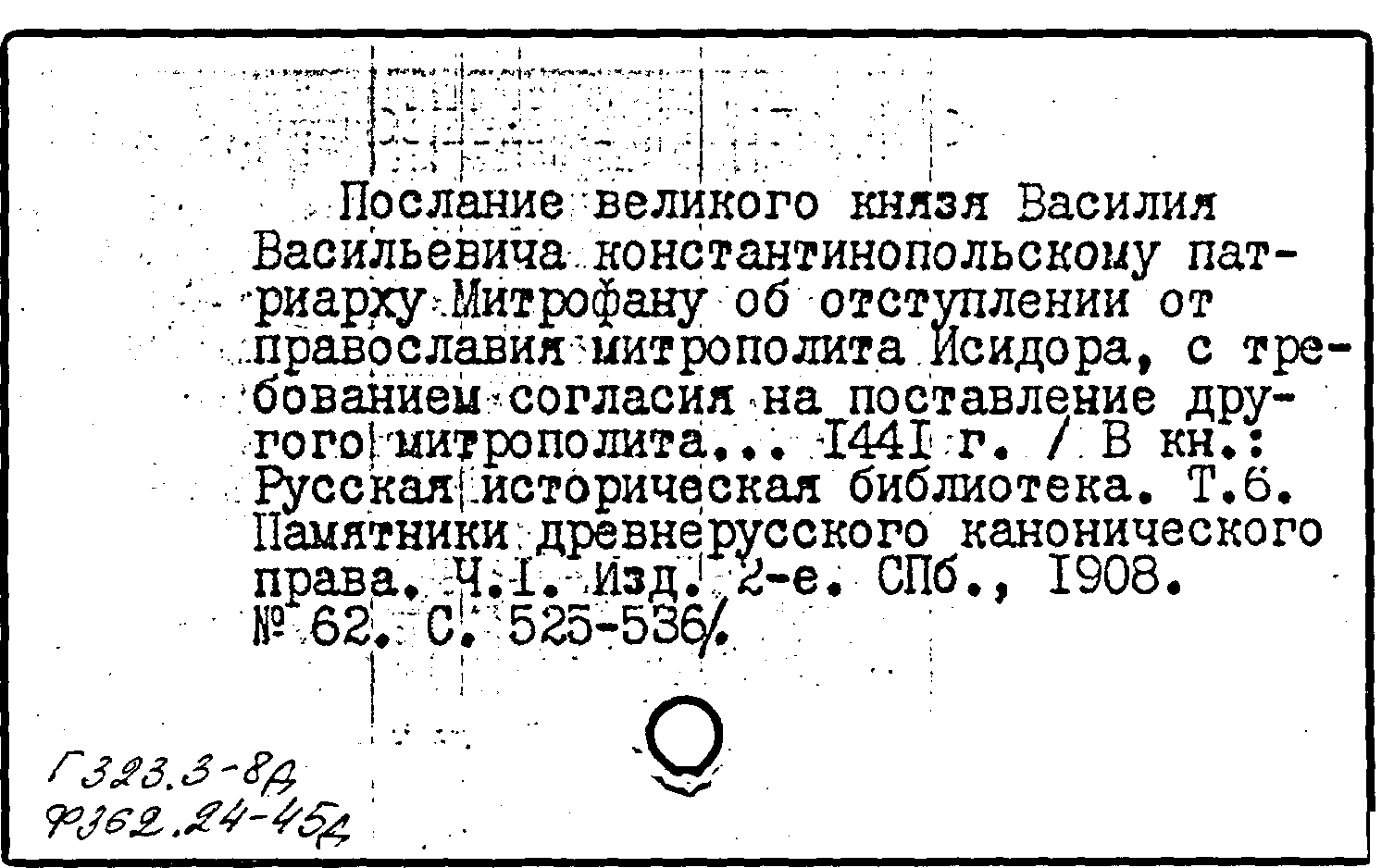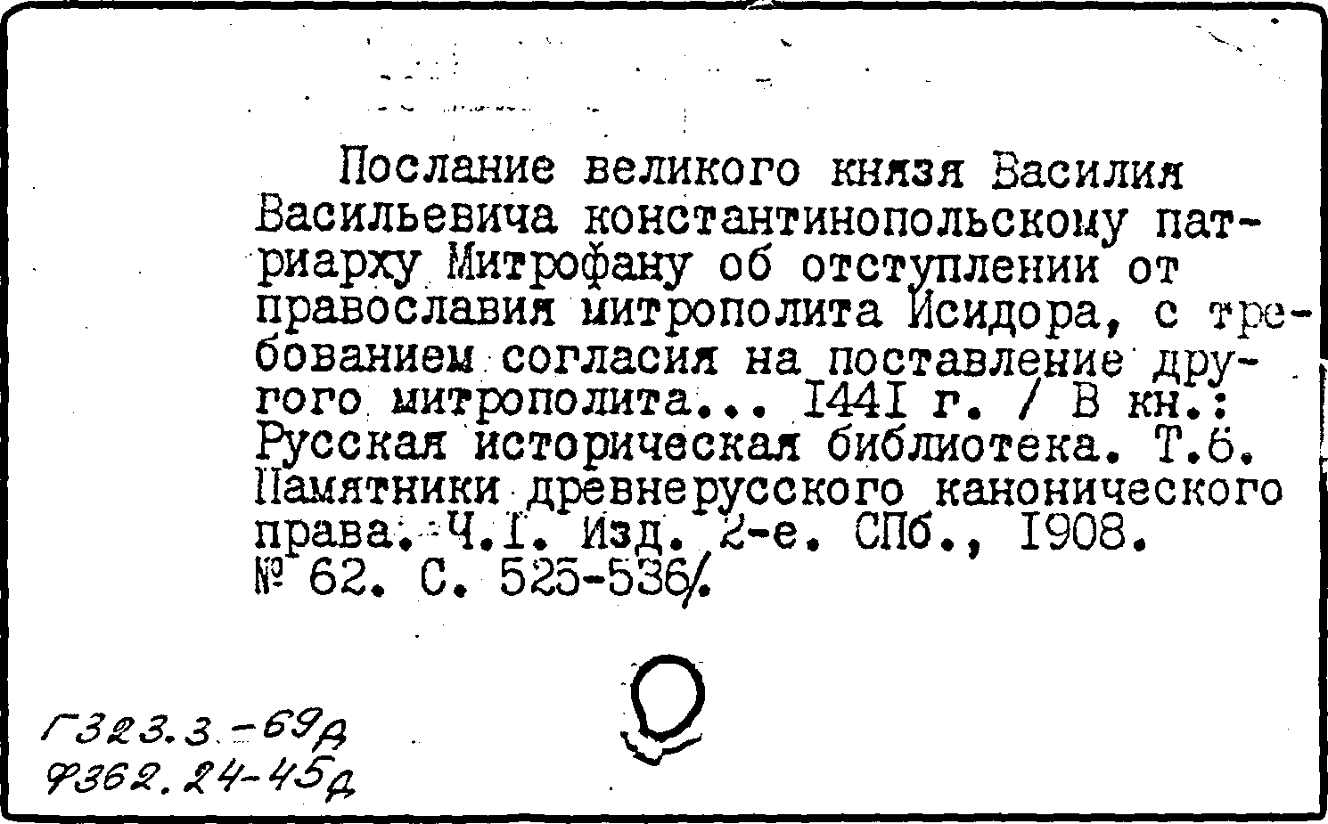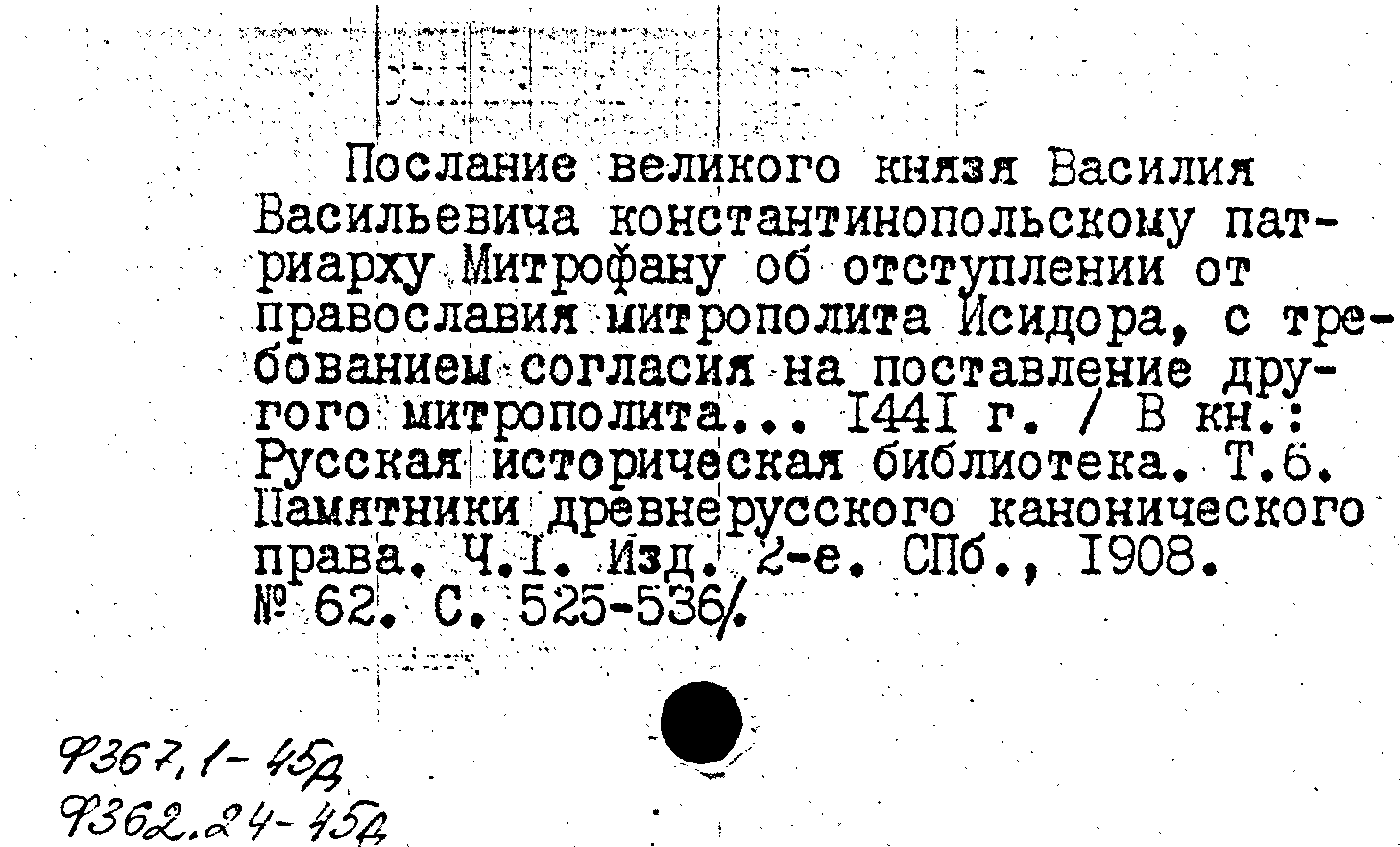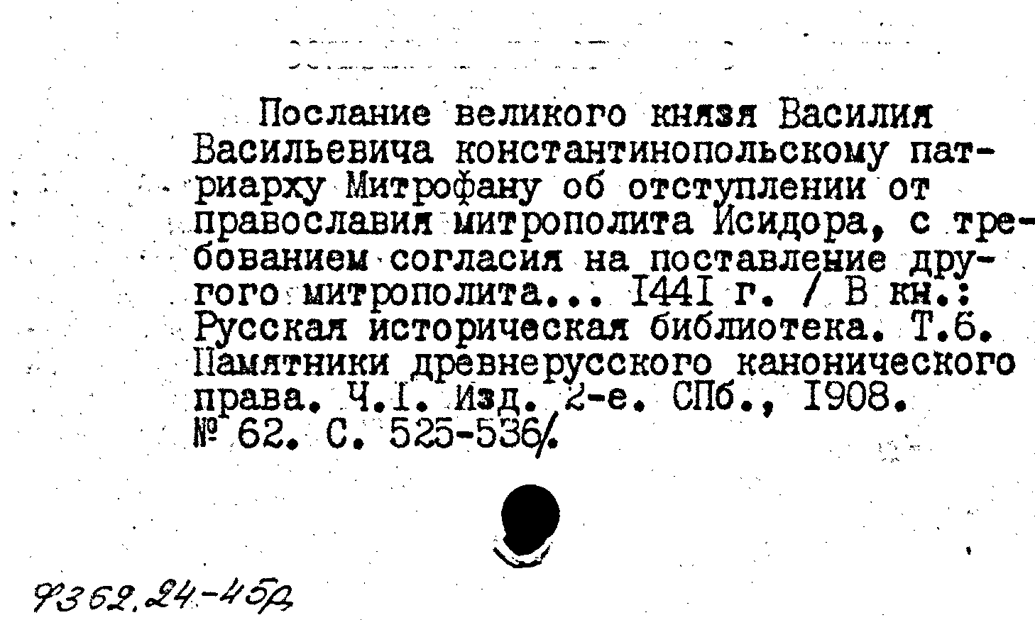 Книга (аналит. описание): Послание великого князя Василия Васильевича константинопольскому патриарху Митрофану об отступлении от православия митрополита Исидора, с требованием согласия на поставление другого митрополита... 1441 г.