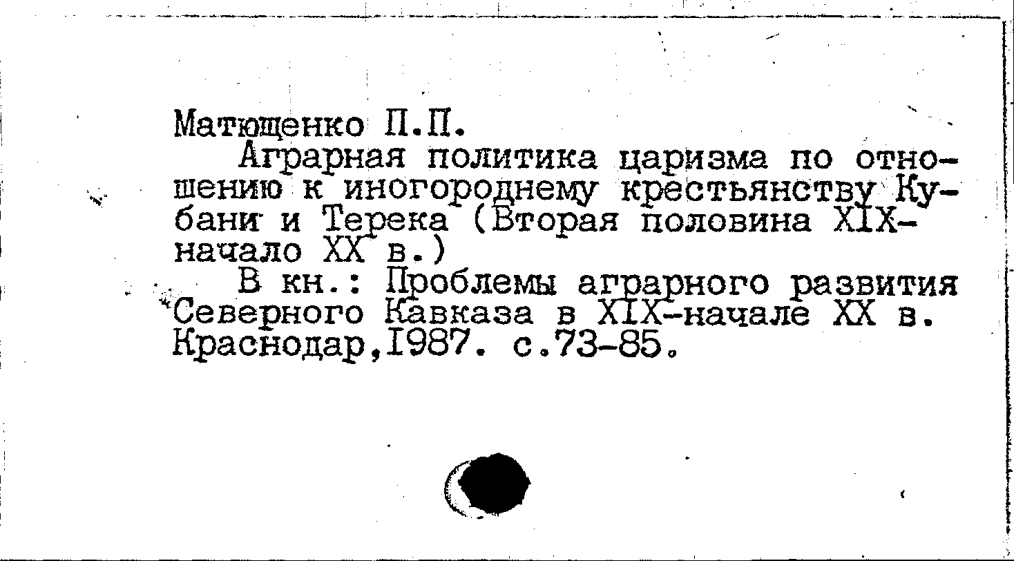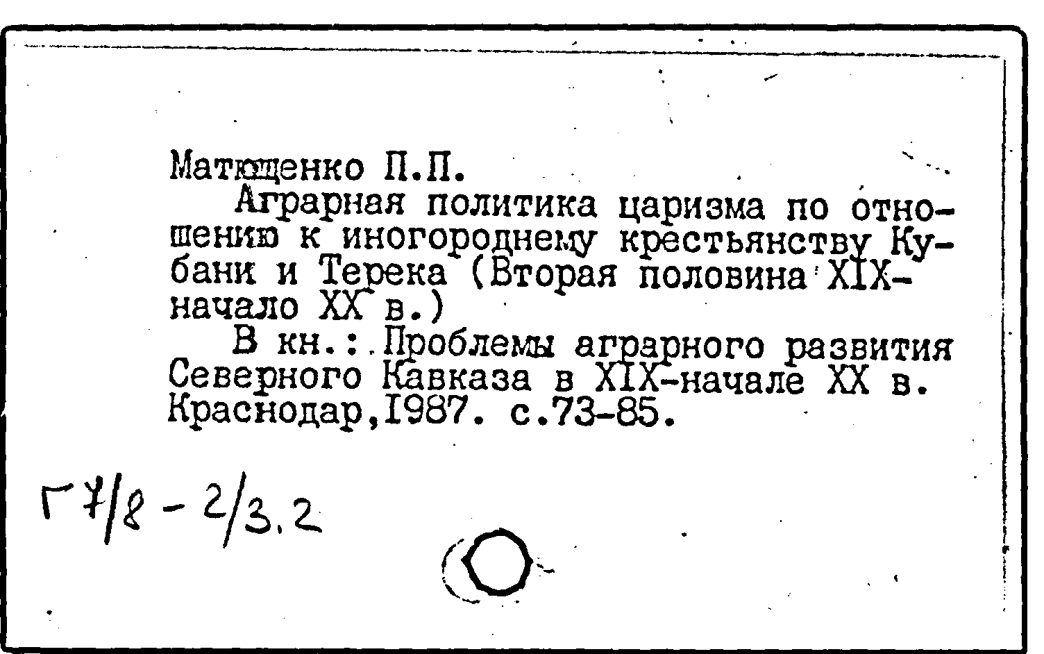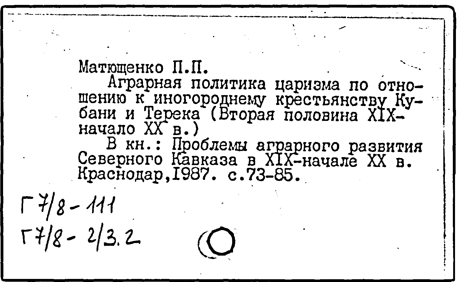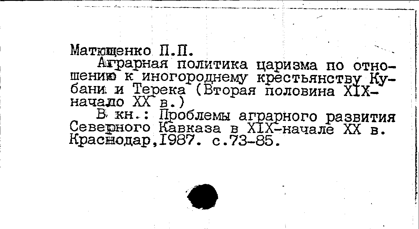 Книга (аналит. описание): Аграрная политика царизма по отношению к иногороднему крестьянству Кубани и Терека (Вторая половина XIX - начало XX в.)