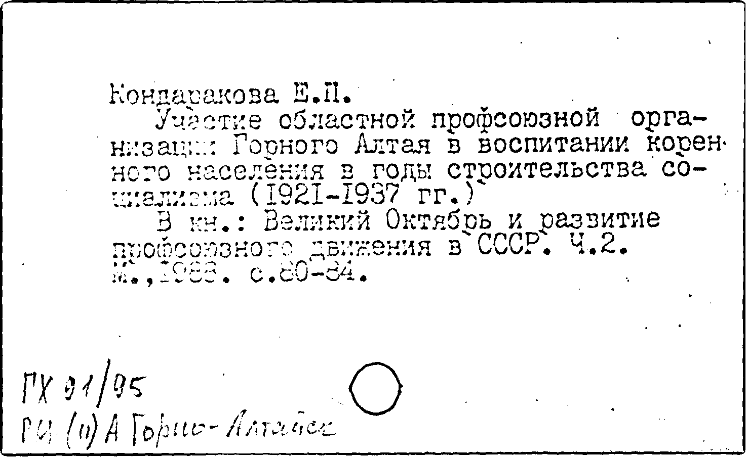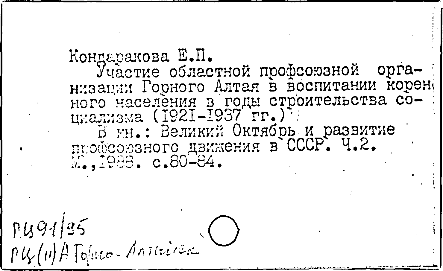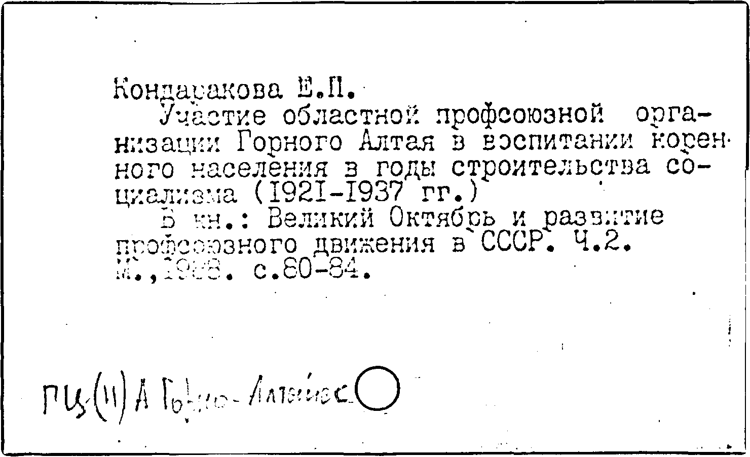 Книга (аналит. описание): Участие областной профсоюзной организации Горного Алтая в воспитании коренного населения в годы строительства социализма (1921-1937 гг.)