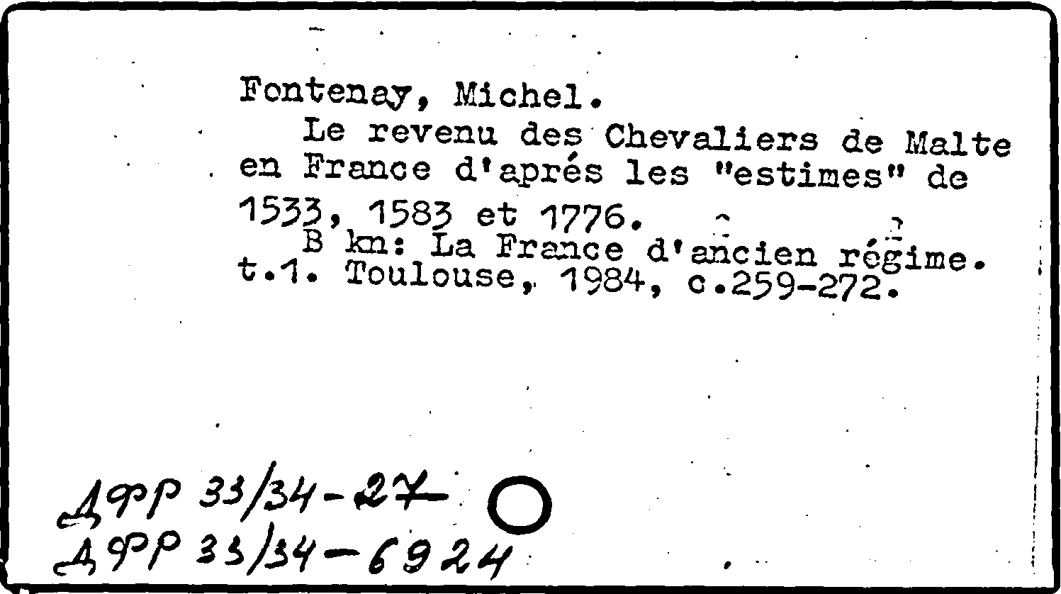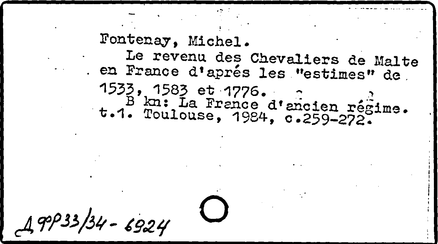 Книга (аналит. описание): Le revenu des Chevaliers de Malte en France d'apres les "estimes" de 1533, 1583 et 1776