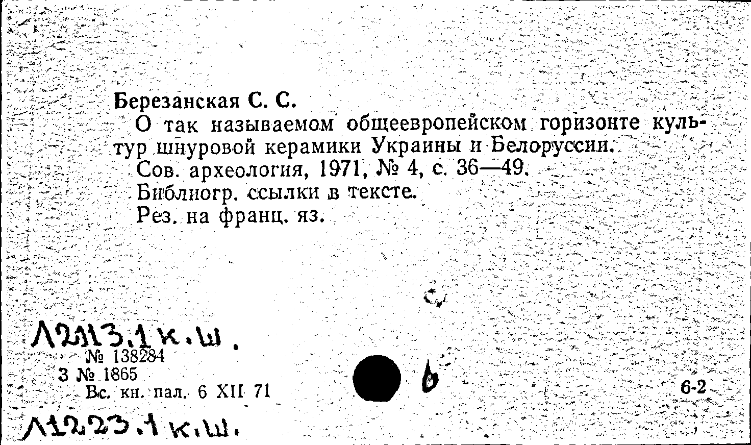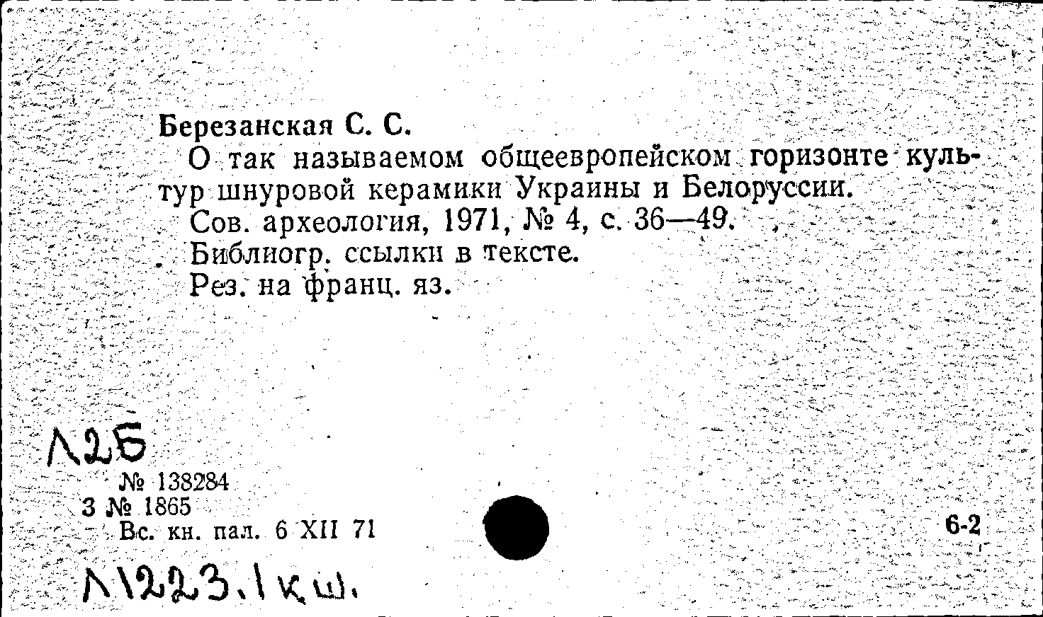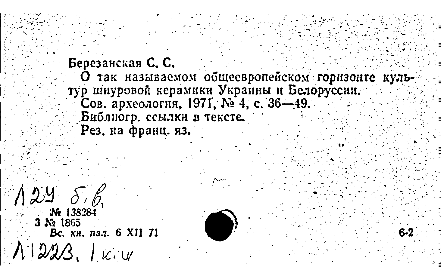 Статья: О так называемом общеевропейском горизонте культур шнуровой керамики Украины и Белоруссии. Советская археология, № 4 /1971: № 4 /1971