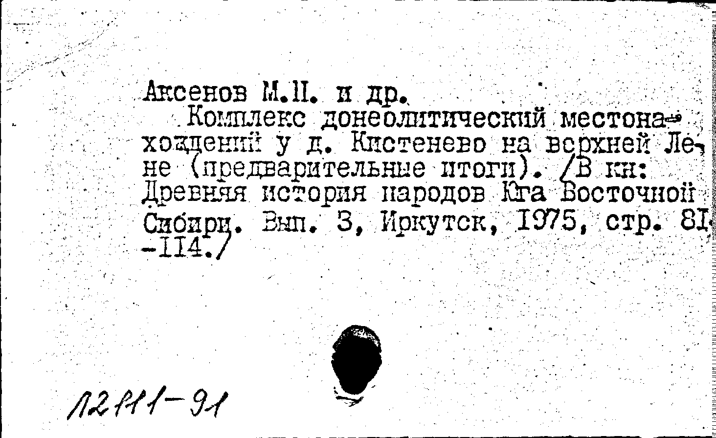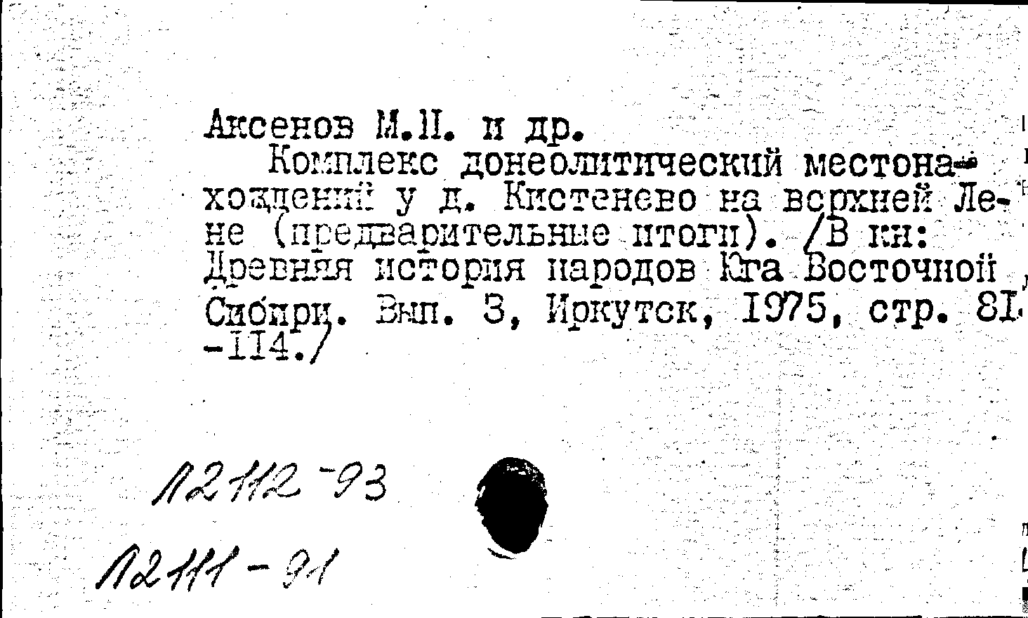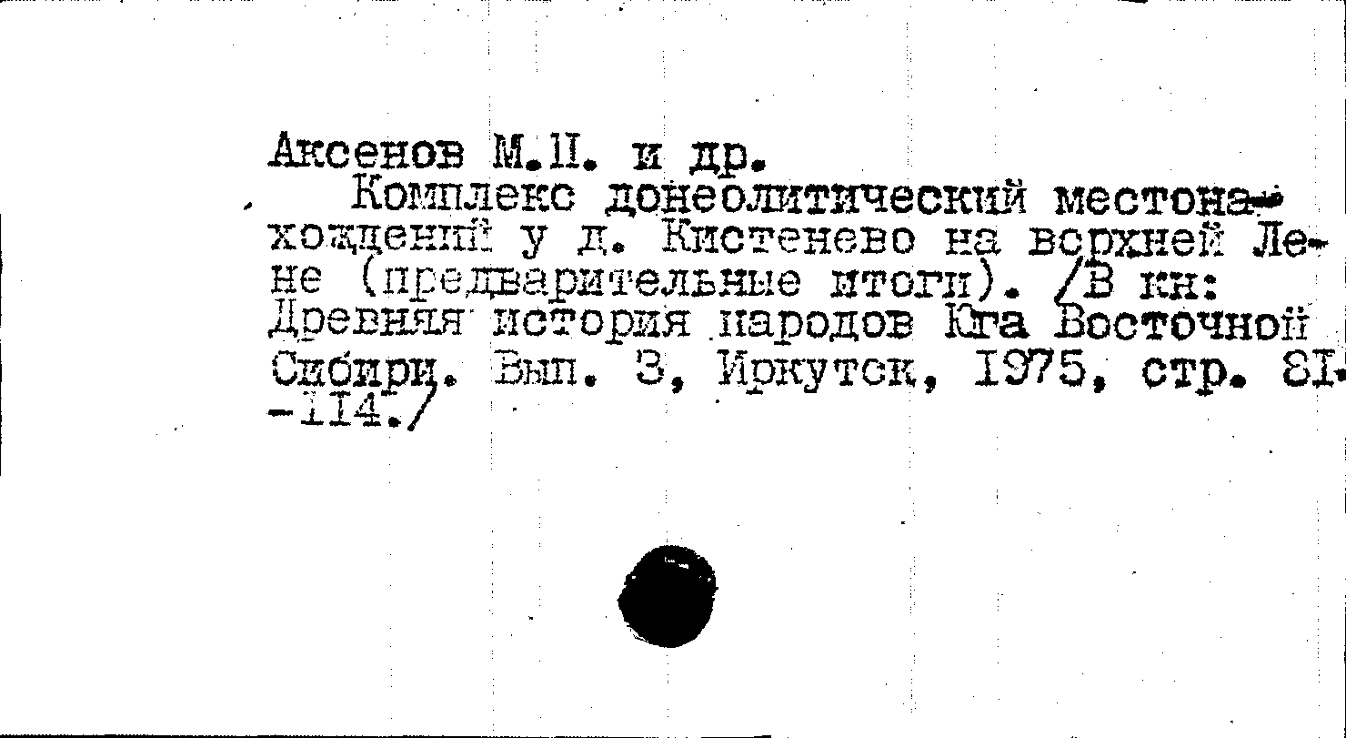 Книга (аналит. описание): Комплекс донеолитических местонахождений у д. Кистенево на верхней Лене (предварительные итоги)
