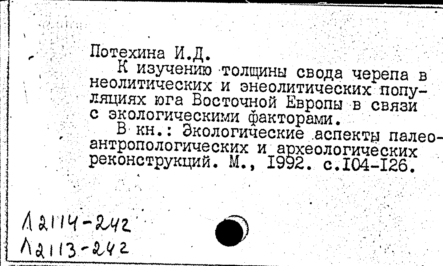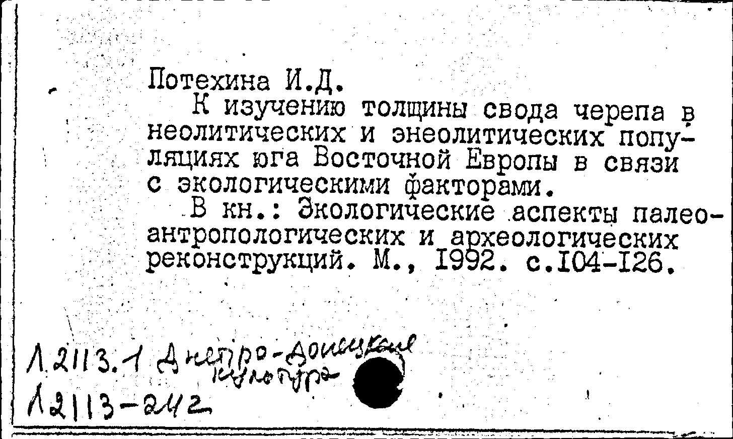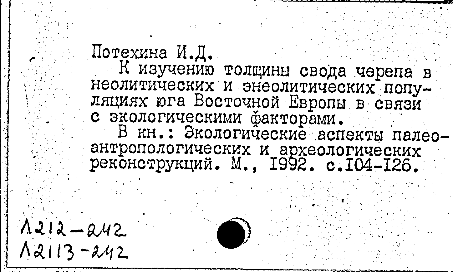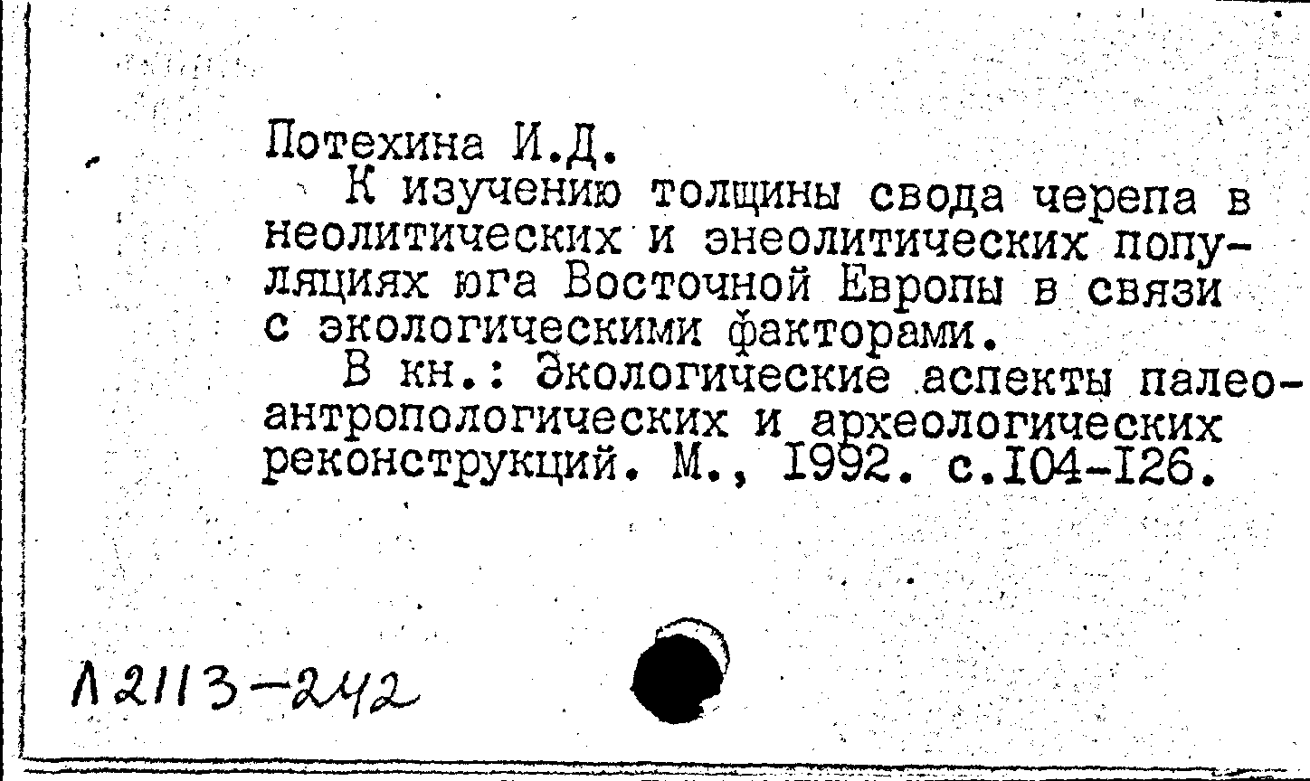 Книга (аналит. описание): К изучению толщины свода черепа в неолитических и энеолитических популяциях юга Восточной Европы в связи с экологическими факторами