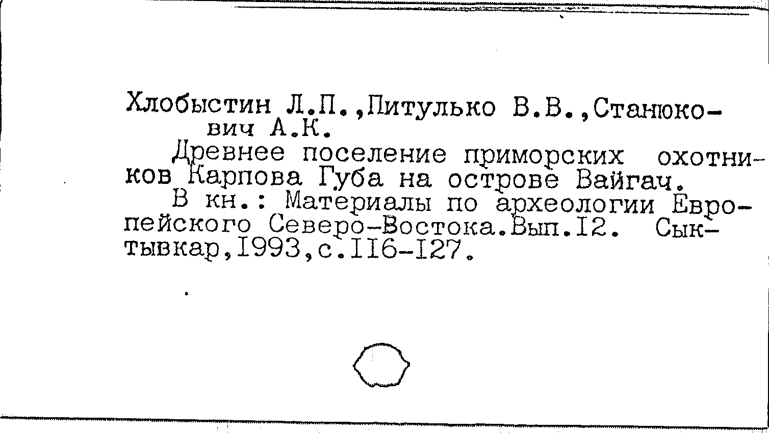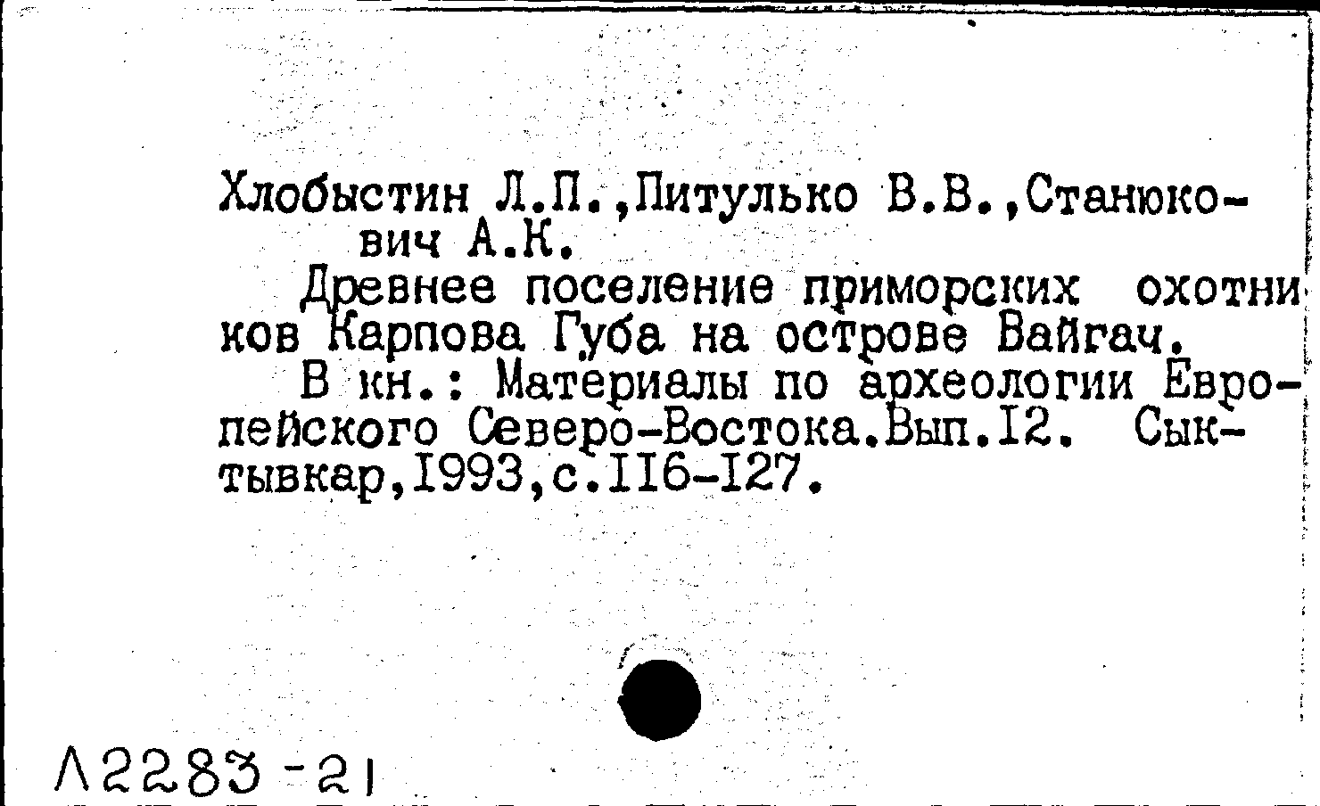 Книга (аналит. описание): Древнее поселение приморских охотников Карпова Губа на острове Вайгач