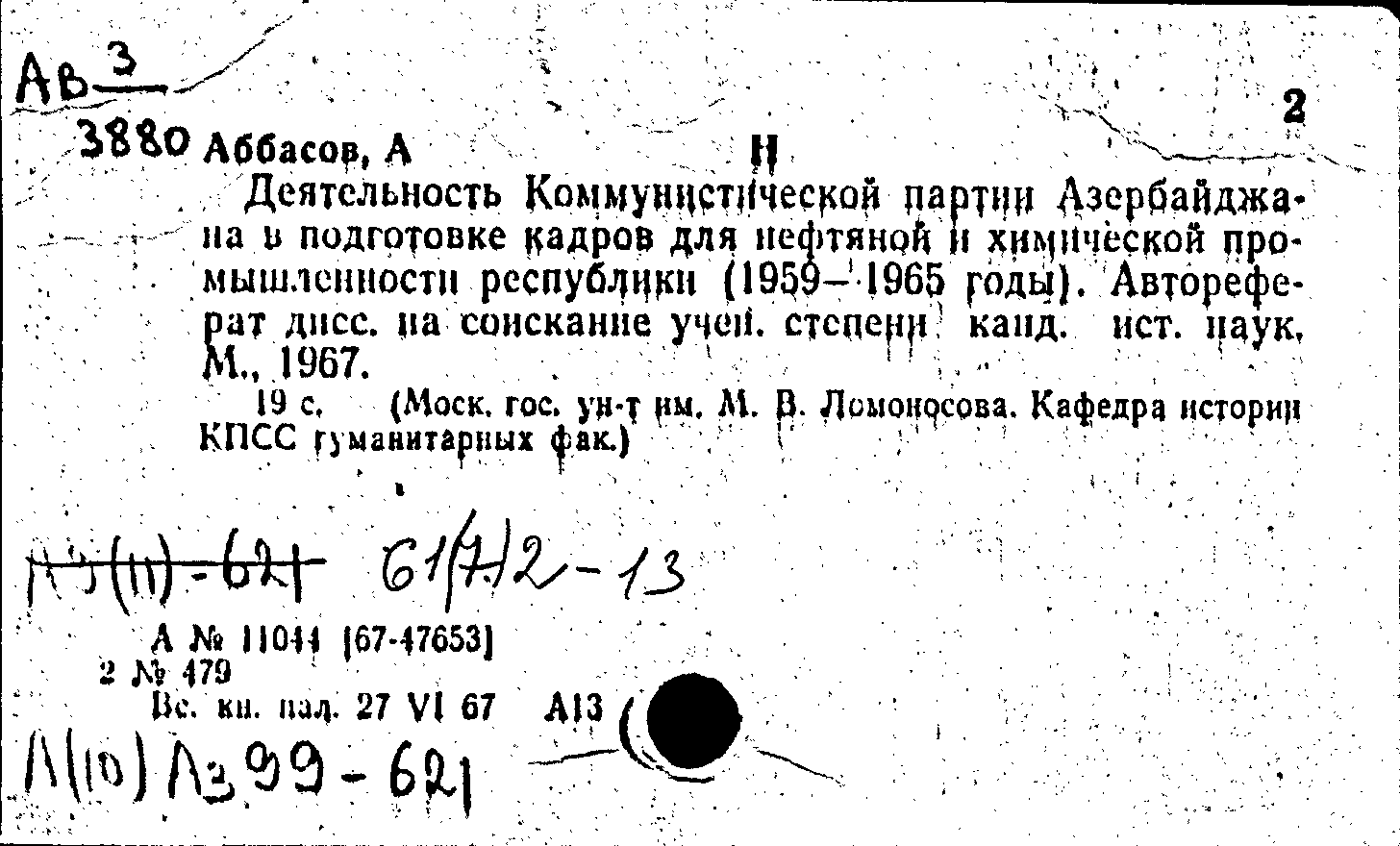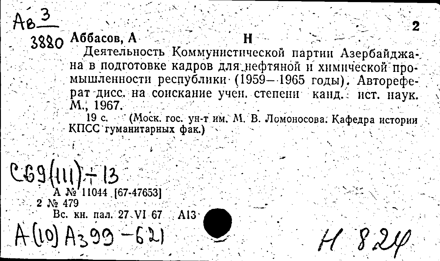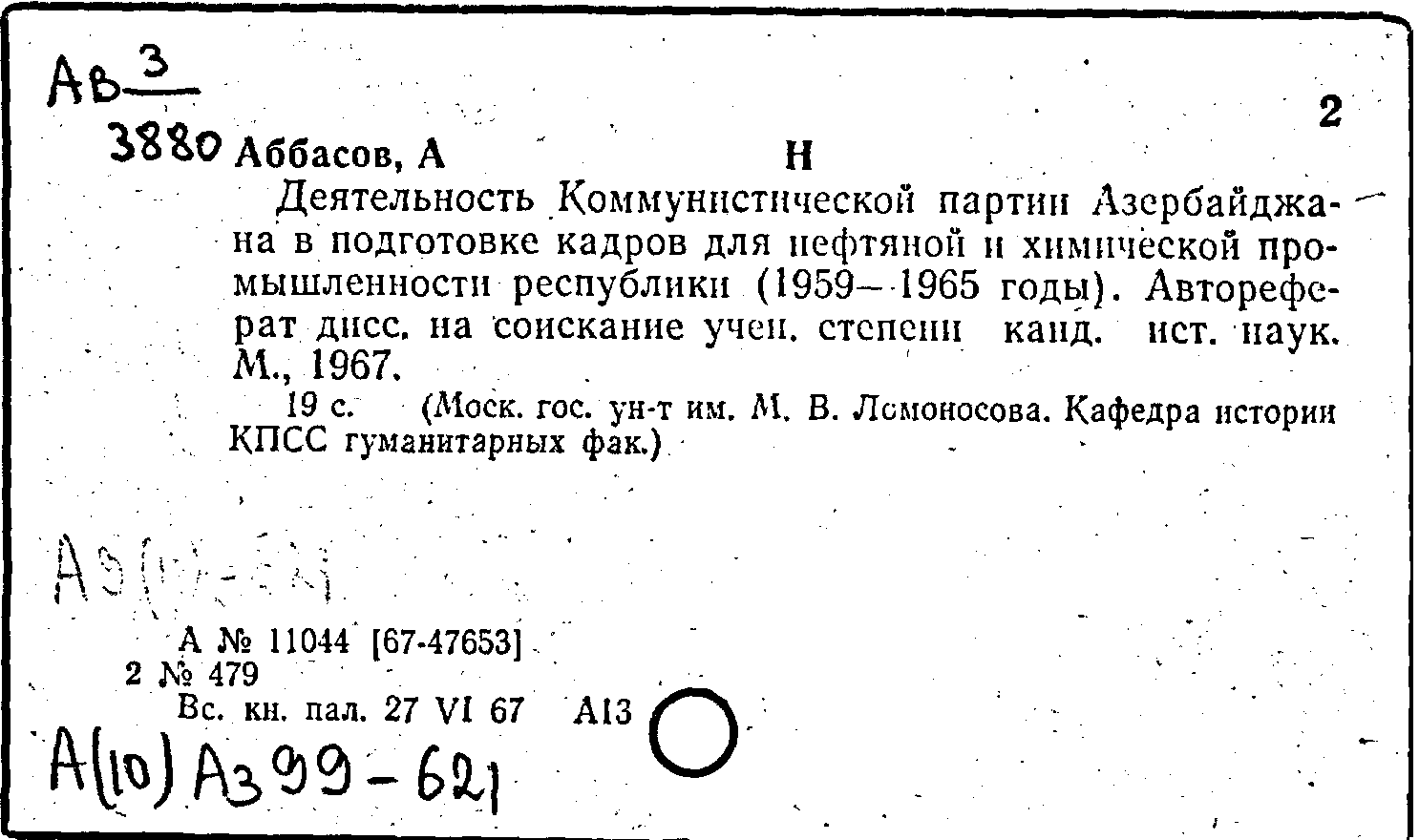 Книга: Деятельность Коммунистической партии Азербайджана в подготовке кадров для нефтяной и химической промышленности республики (1959-1965 годы): автореферат диссертации на соискание ученой степени кандидата исторических наук