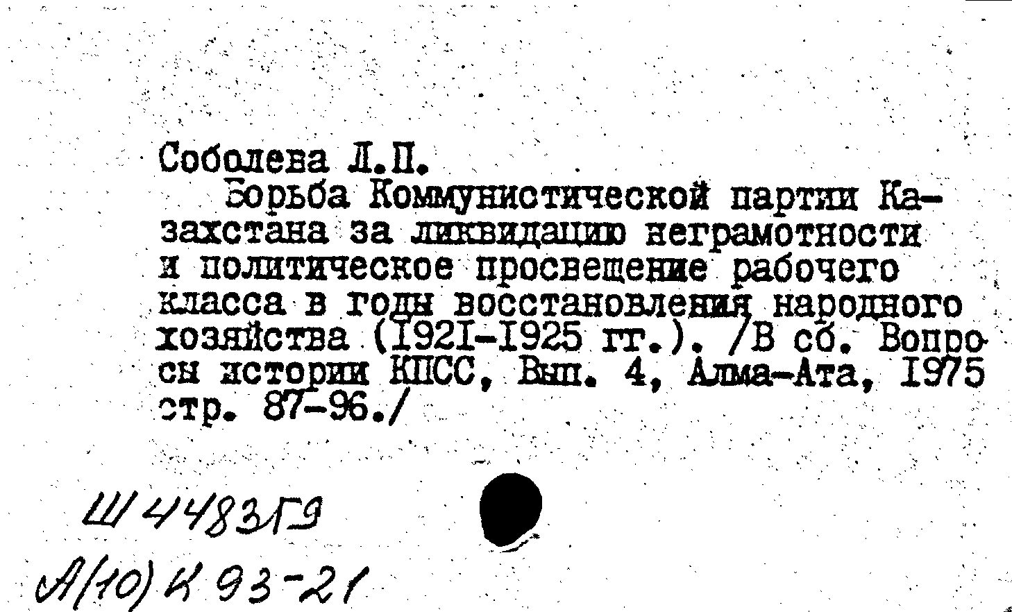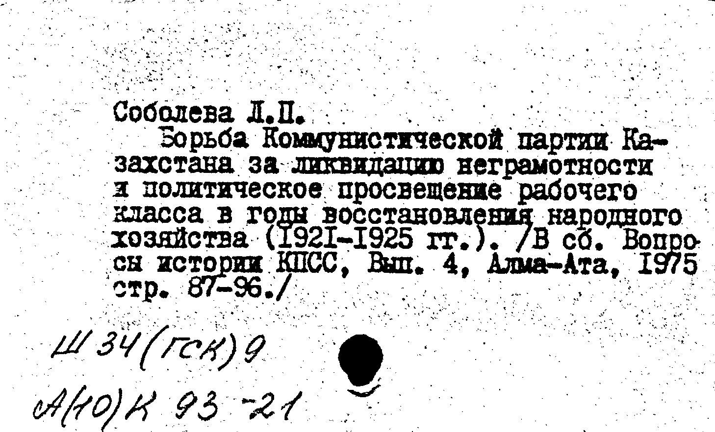 Книга (аналит. описание): Борьба Коммунистической партии Казахстана за ликвидацию неграмотности и политическое просвещение рабочего класса в годы восстановления народного хозяйства (1921-1925 гг.)