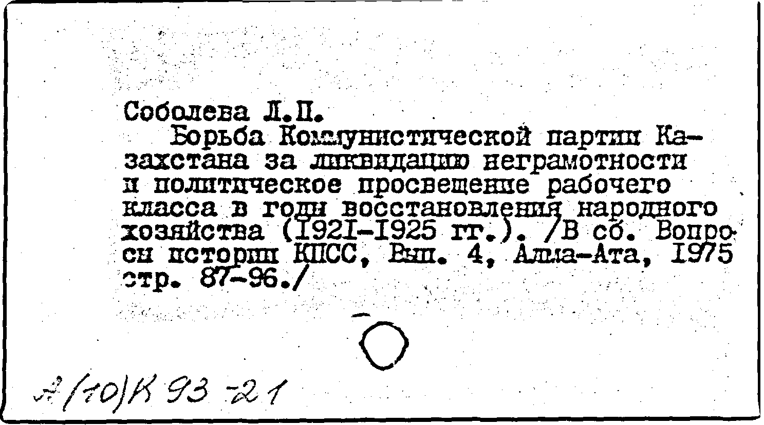 Борьба Коммунистической партии Казахстана за ликвидацию неграмотности и политическое просвещение рабочего класса в годы восстановления народного хозяйства (1921-1925 гг.)