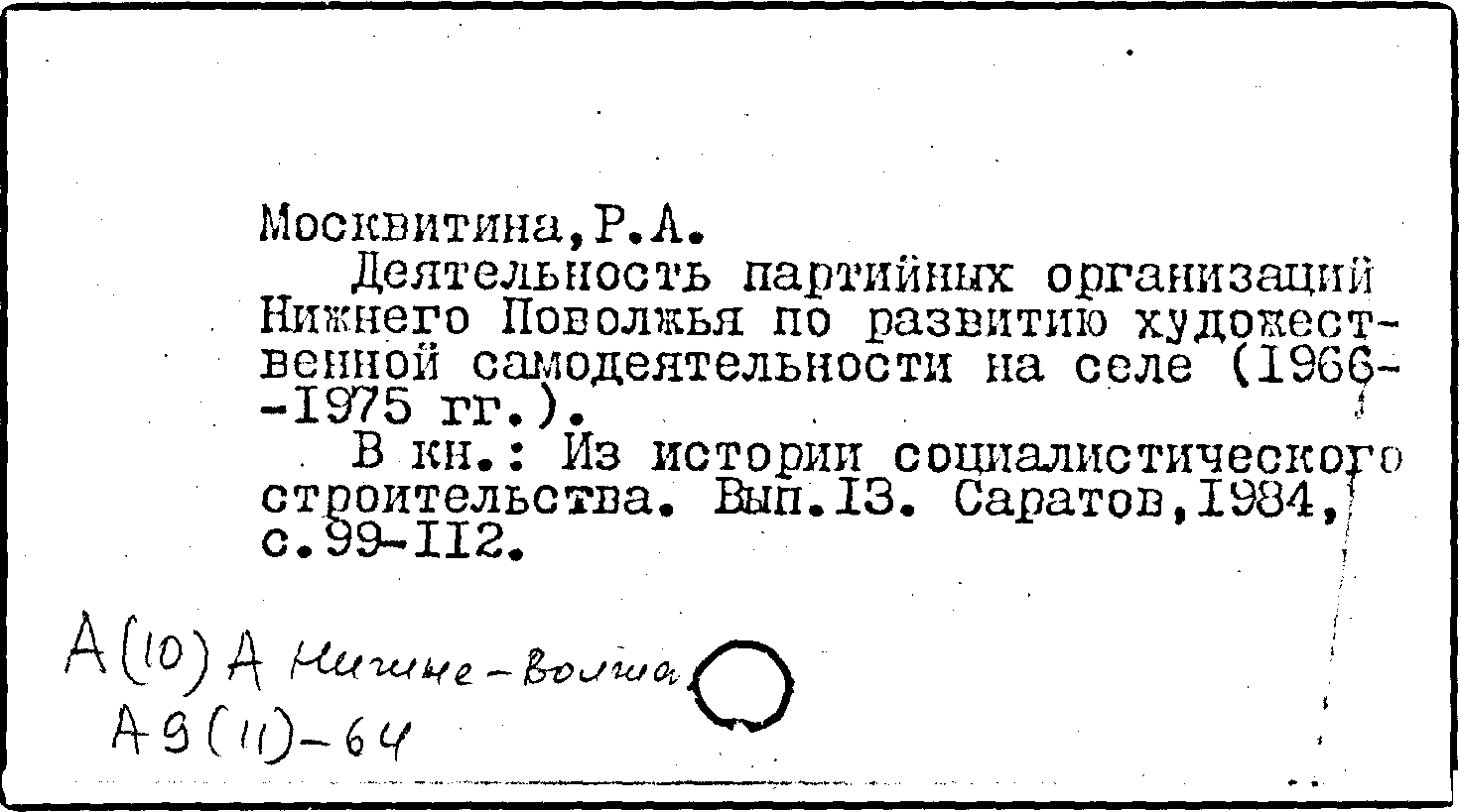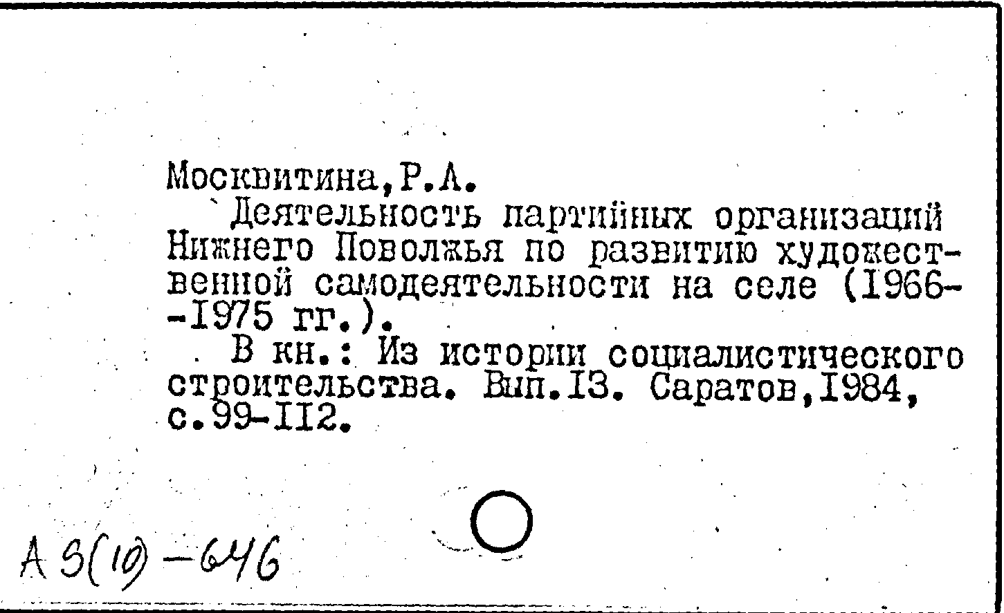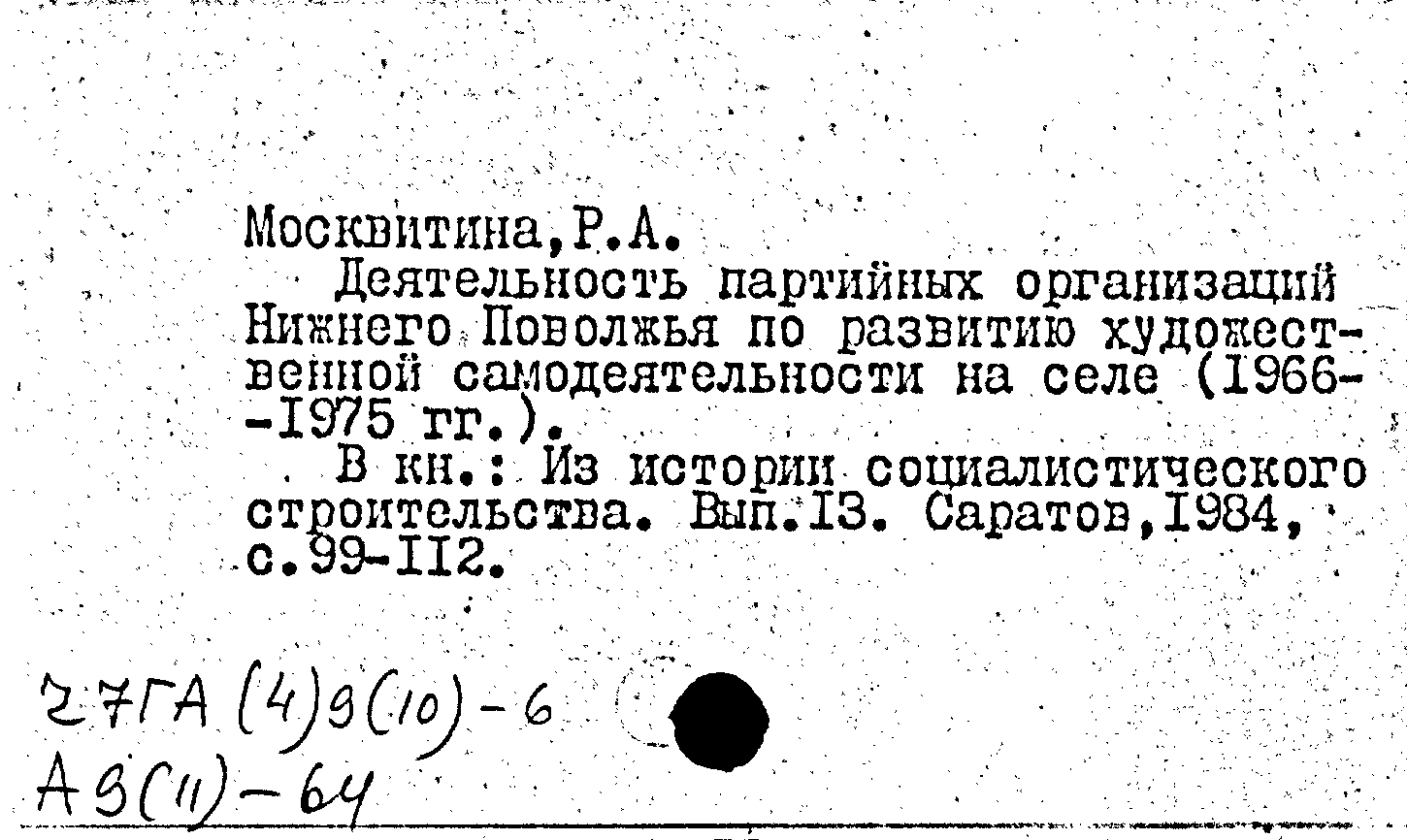 Книга (аналит. описание): Деятельность партийных организаций Нижнего Поволжья по развитию художественной самодеятельности на селе (1966-1975 гг.)