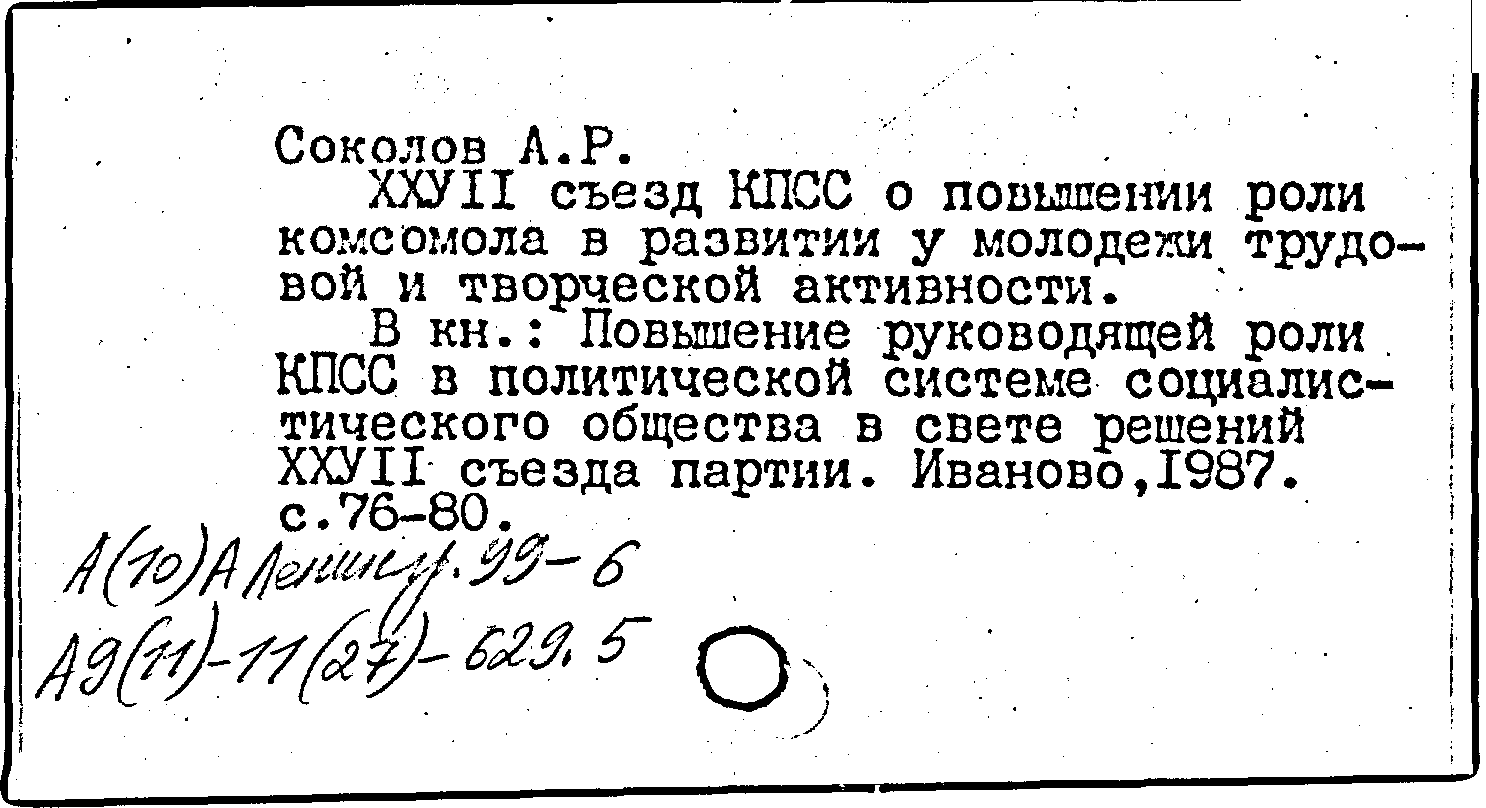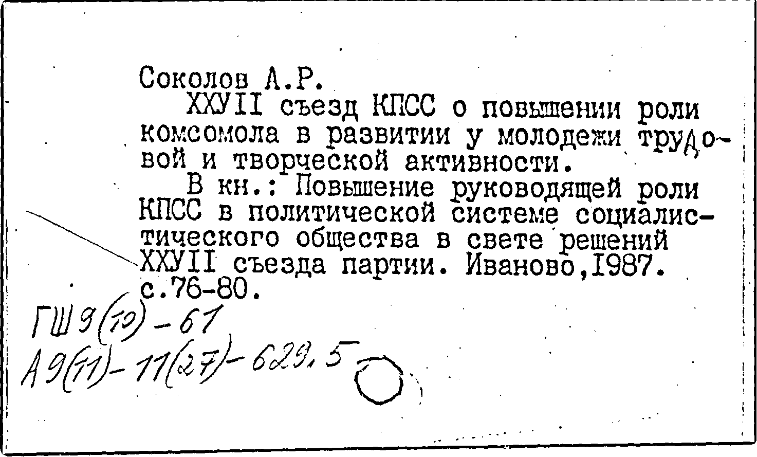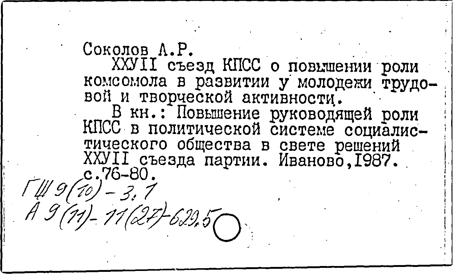 Книга (аналит. описание): XXVII съезд КПСС о повышении роли комсомола в развитии у молодежи трудовой и творческой активности