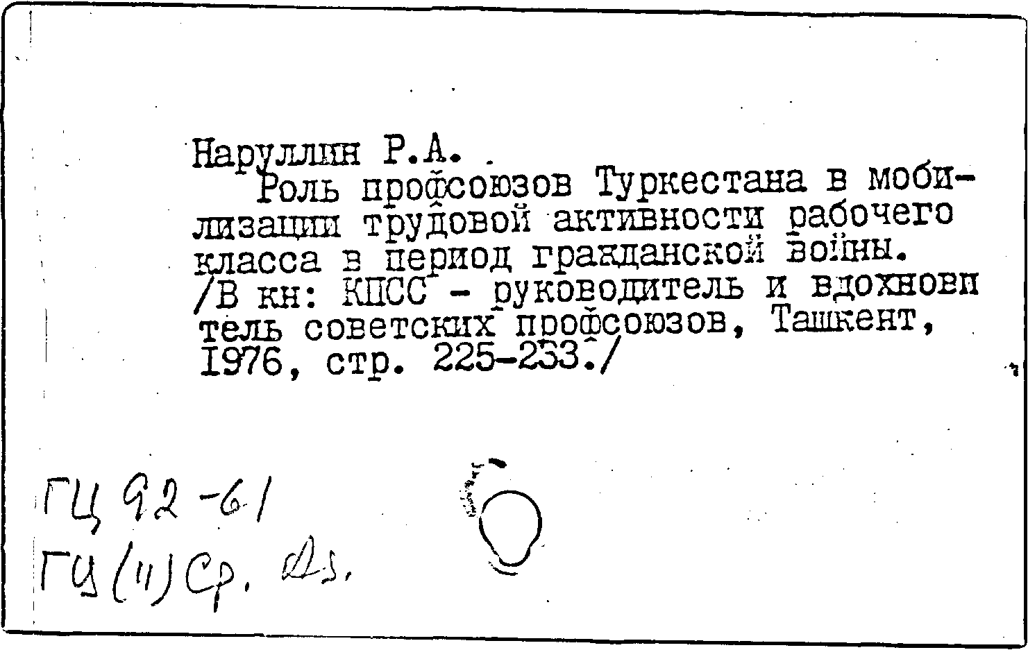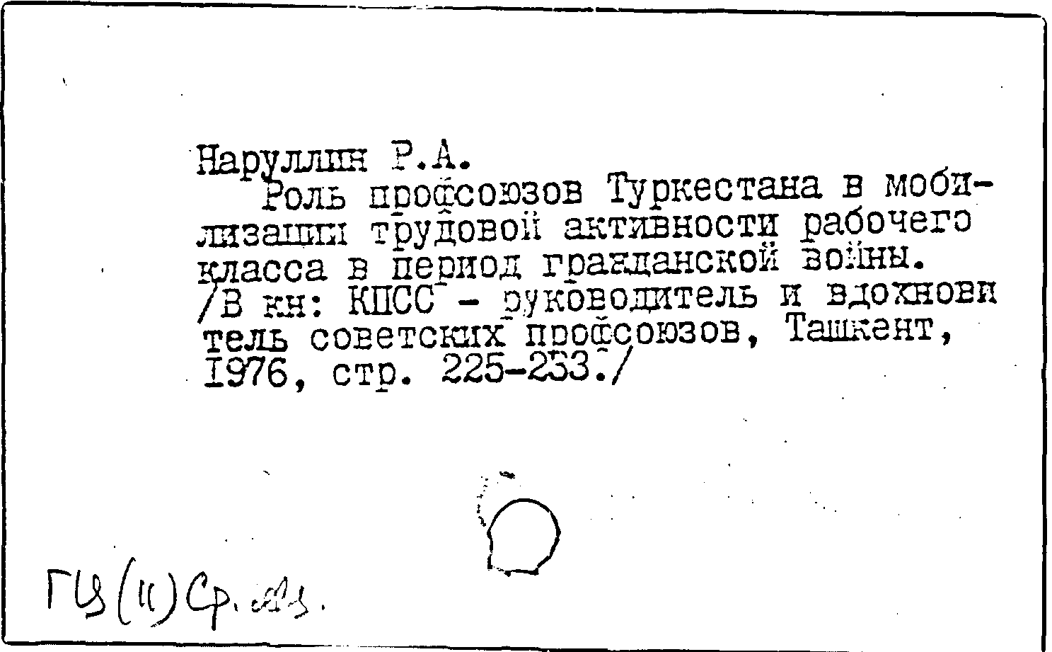 Книга (аналит. описание): Роль профсоюзов Туркестана в мобилизации трудовой активности рабочего класса в период гражданской войны