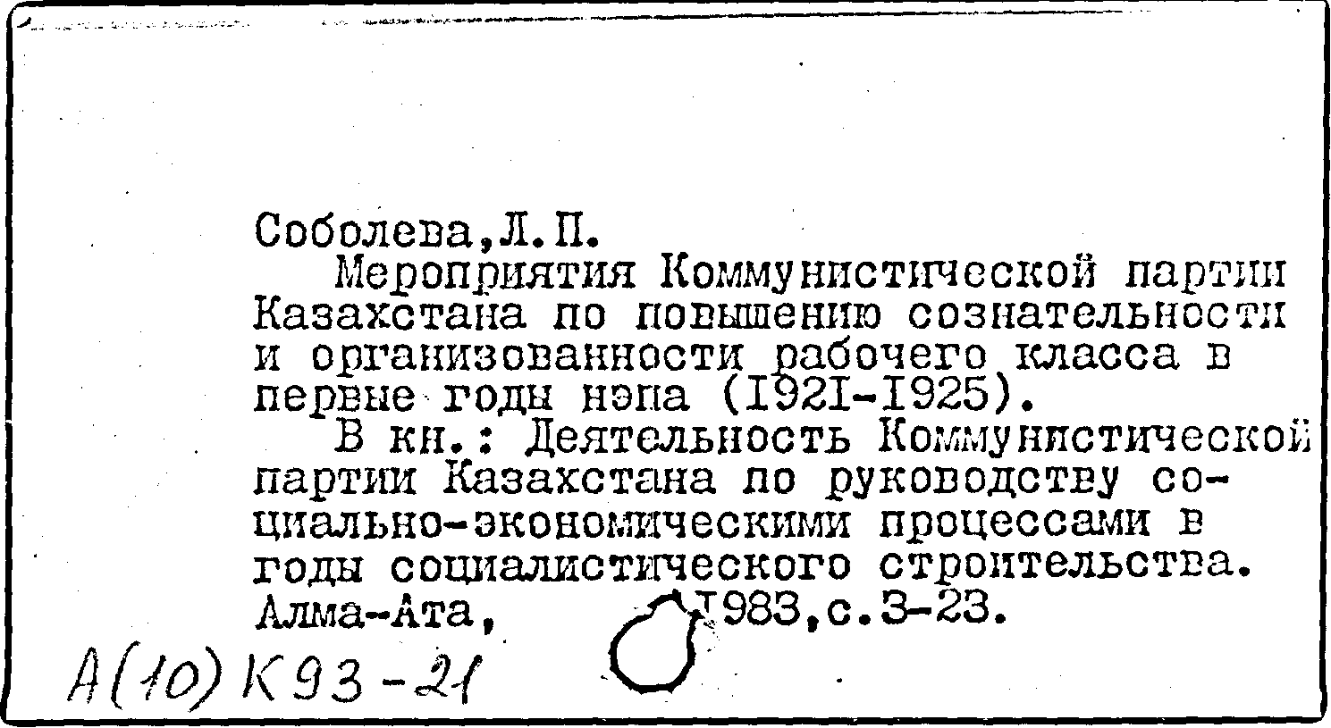 Книга (аналит. описание): Мероприятия Коммунистической партии Казахстана по повышению сознательности и организованности рабочего класса в первые годы нэпа (1921-1925)