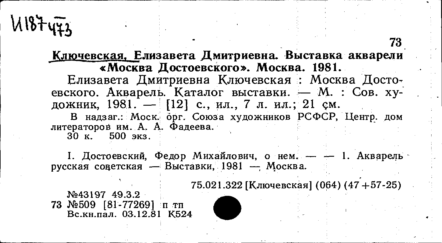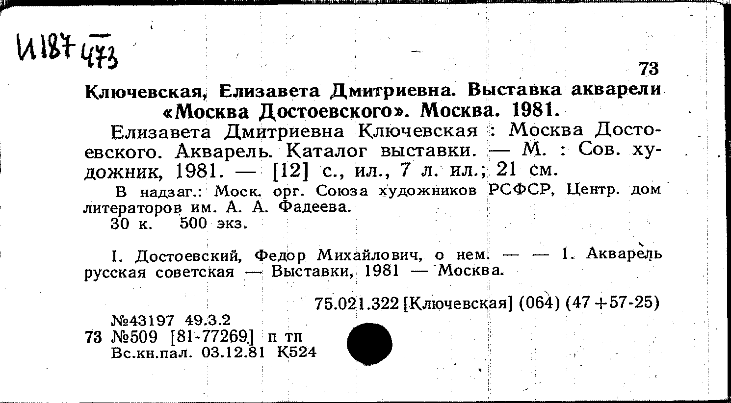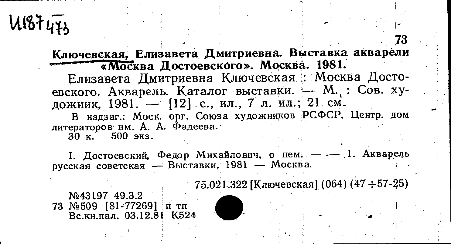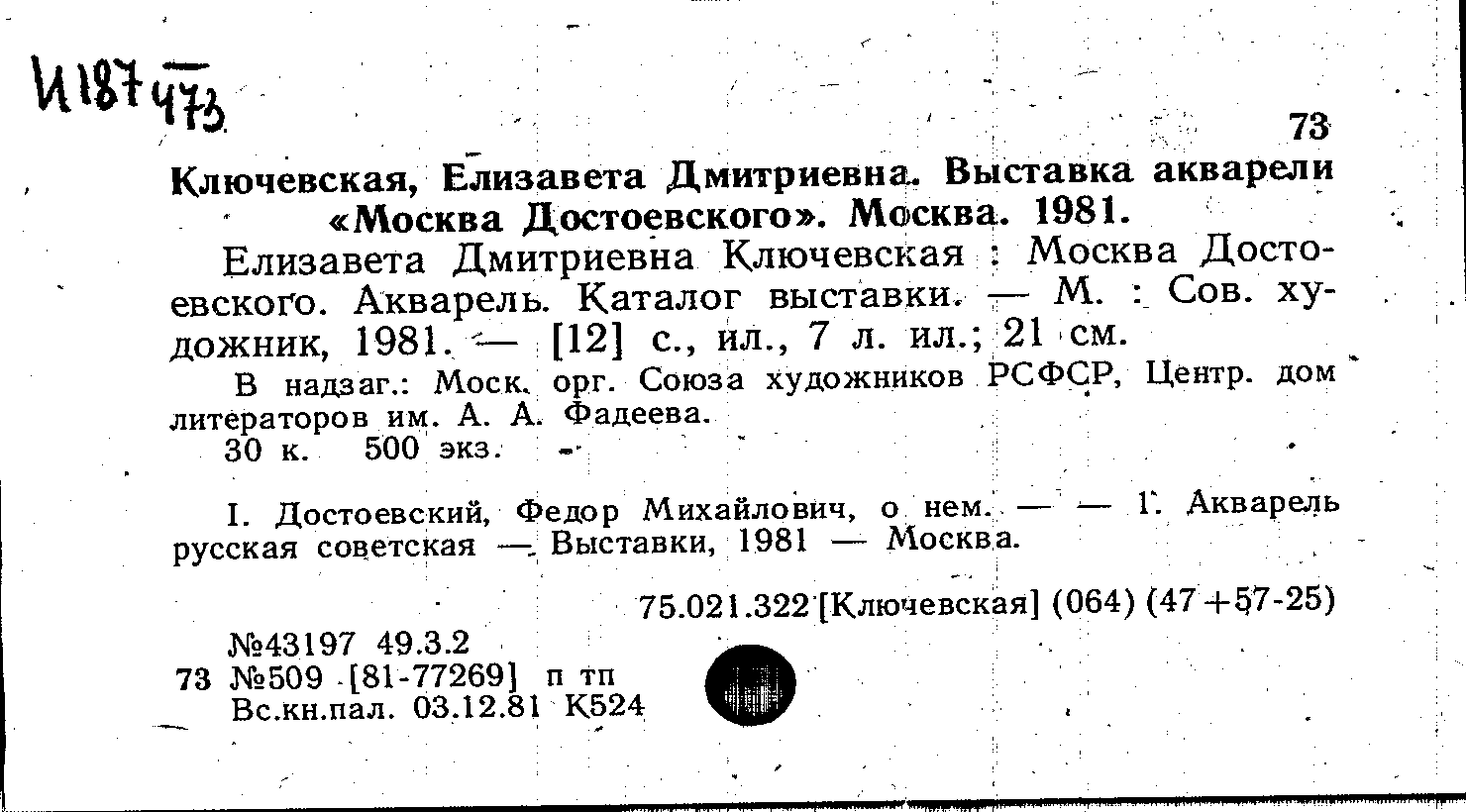 Ключевская, Елизавета Дмитриевна. Выставка акварели "Москва Достоевская" (1981; Москва)