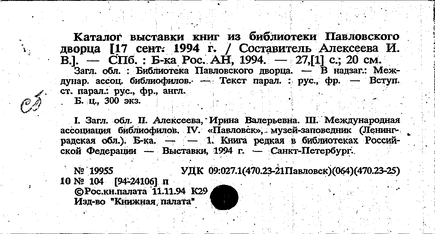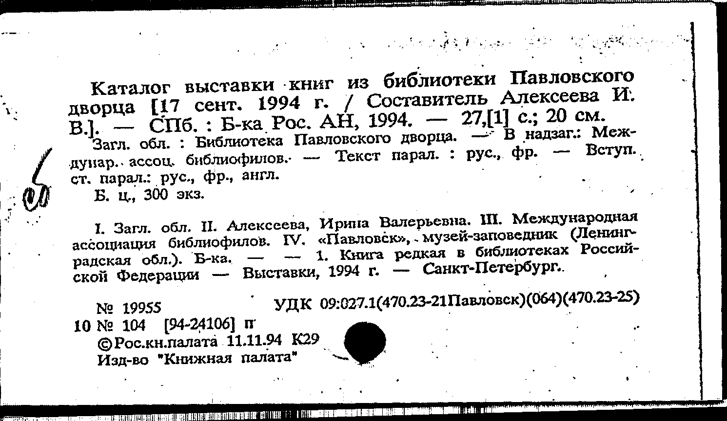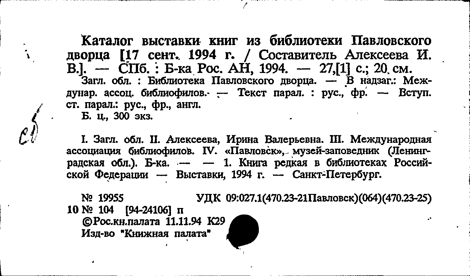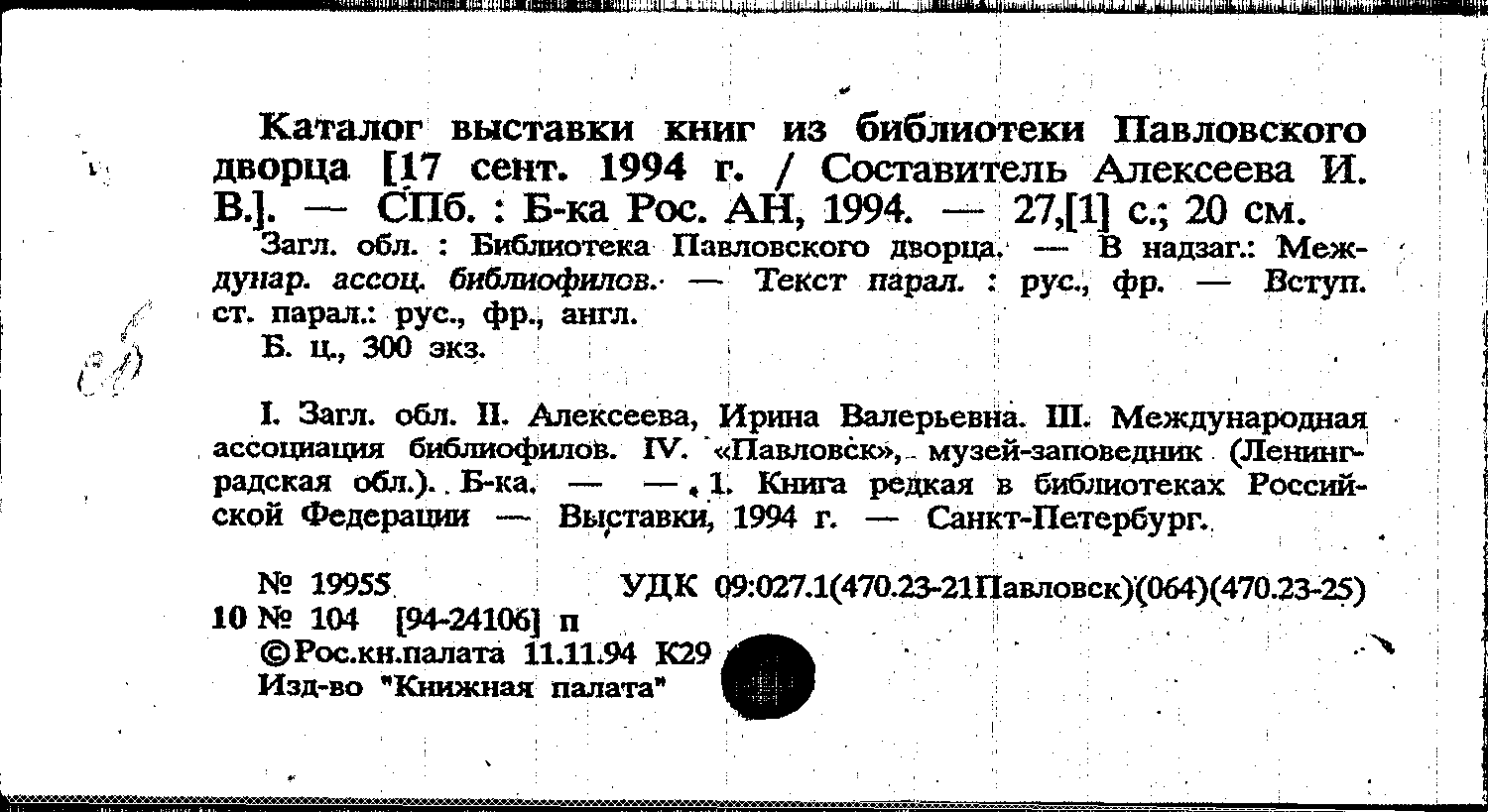 Каталог выставки книг из библиотеки Павловского дворца [17 сентября 1994 г.]