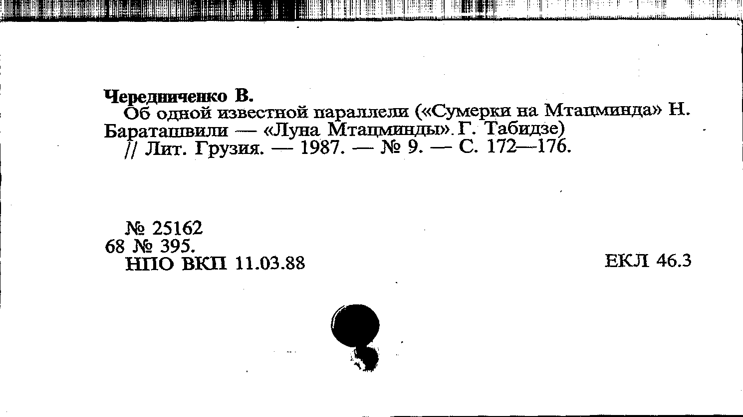 Книга (аналит. описание): Об одной известной параллели ("Сумерки на Мтацминда" Н. Бараташвили - "Луна Мтацминды". Г. Табидзе)