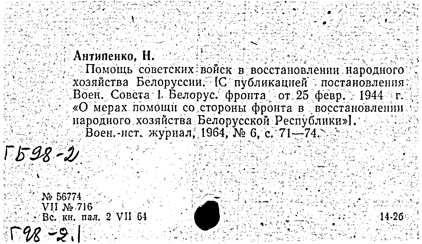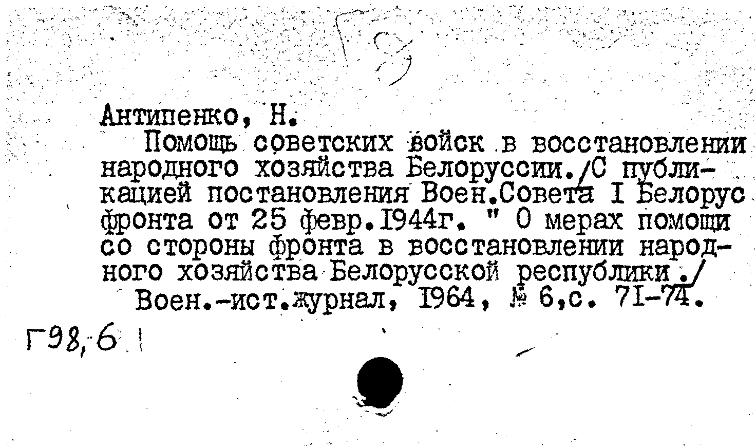 Помощь советских войск в восстановлении народного хозяйства Белоруссии. Военно-исторический журнал, N 6 1964: N 6 1964