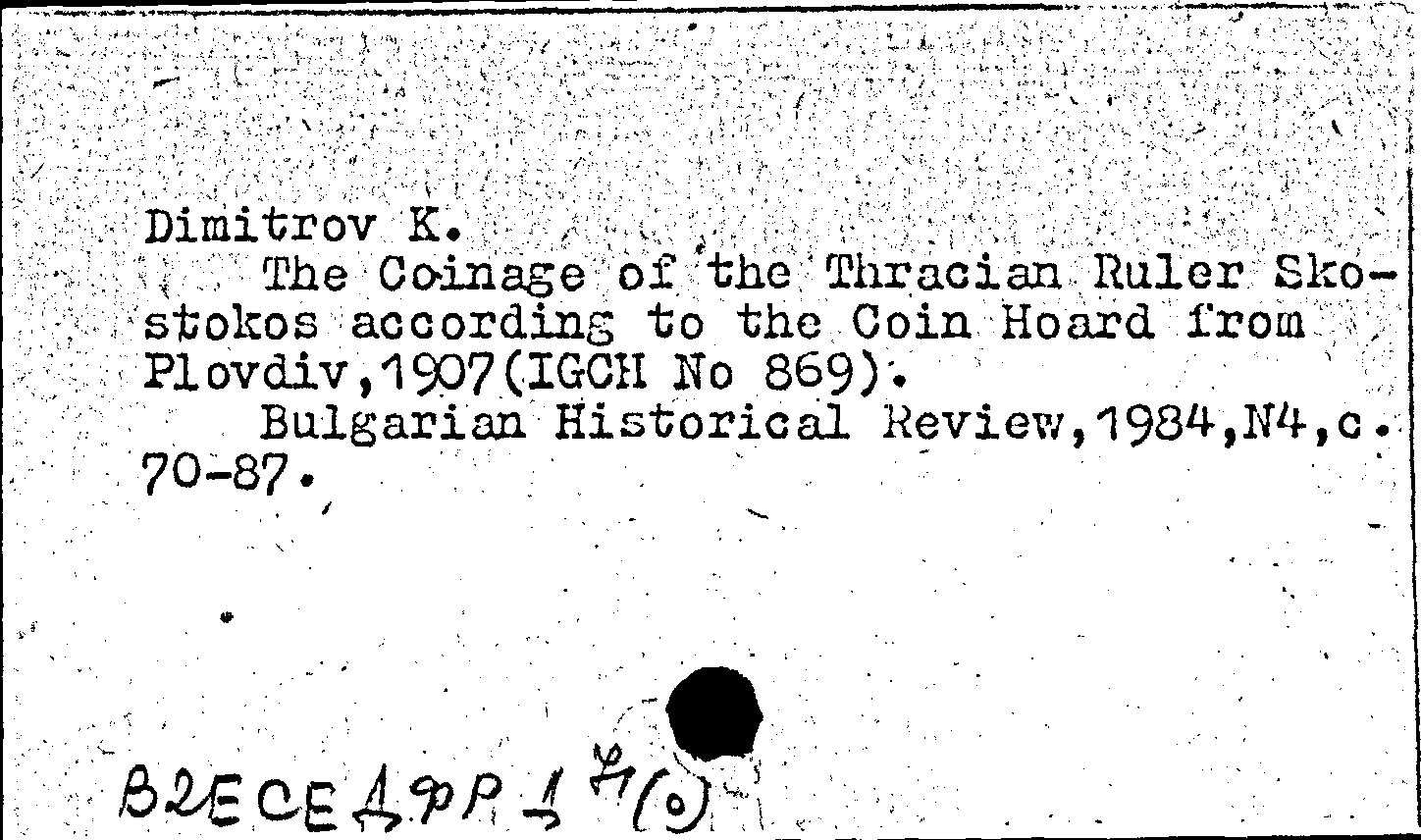 Статья: The Coinage of the Thracian Ruler Skostokos according to the Coin Hoard from Plovdiv, 1907 (IGCH N 869). Bulgarian historical review, N 4 1984: N 4 1984