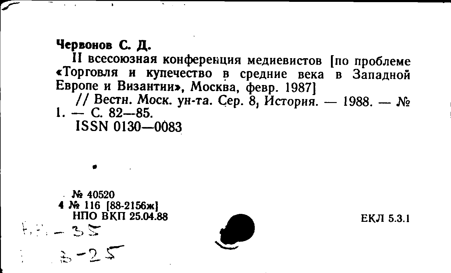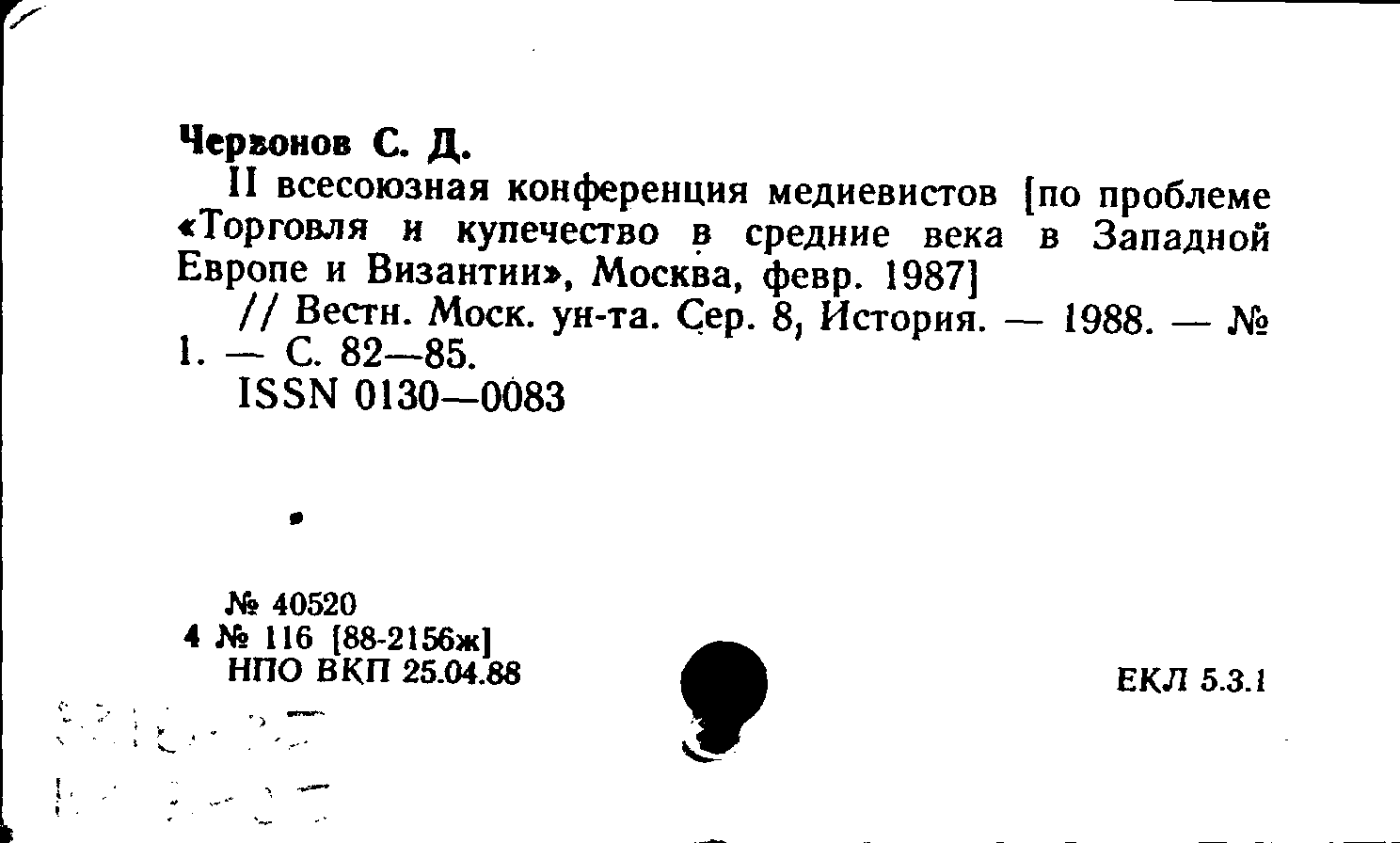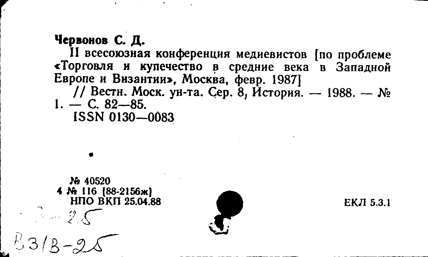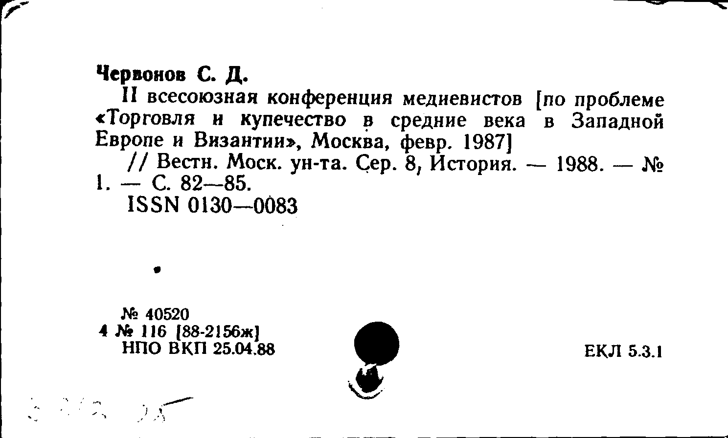 Статья: II всесоюзная конференция медиевистов [по проблеме "Торговля и купечество в средние века в Западной Европе и Византии", Москва, февраль 1987]. Вестник Московского университета. Сер. 8: История, N 1 1988: N 1 1988