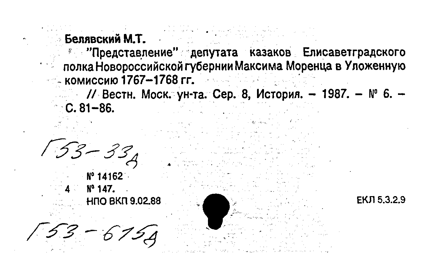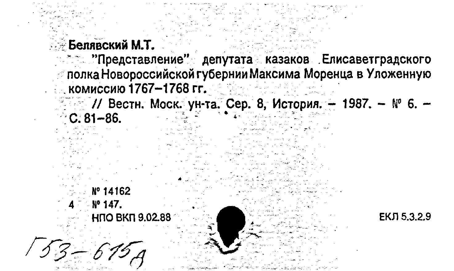 Статья: "Представление" депутата казаков Елисаветградского полка Новороссийской губернии Максима Моренца в Уложенную комиссию 1767-1768 гг.. Вестник Московского университета. Сер. 8: История, N 6 1987: N 6 1987