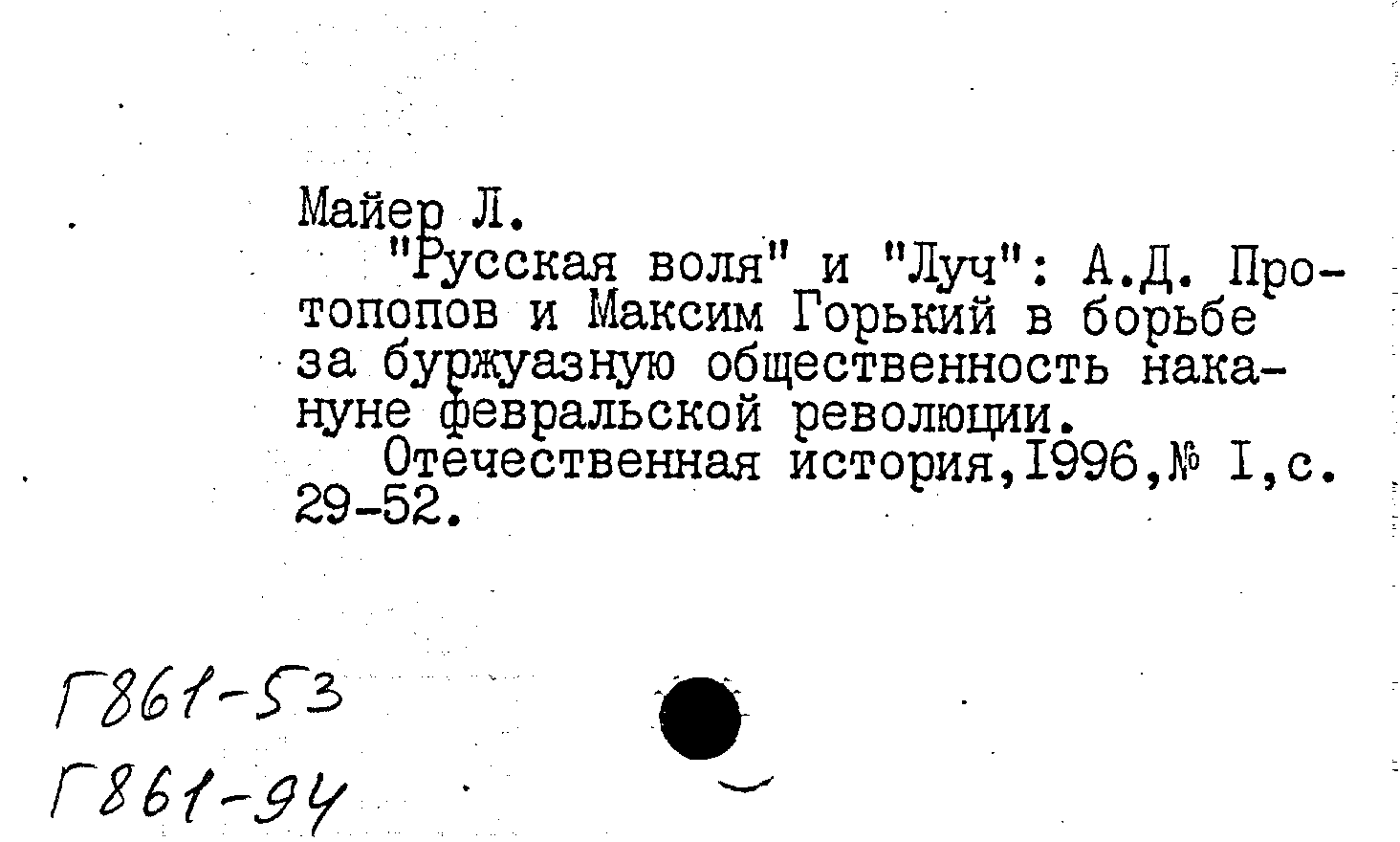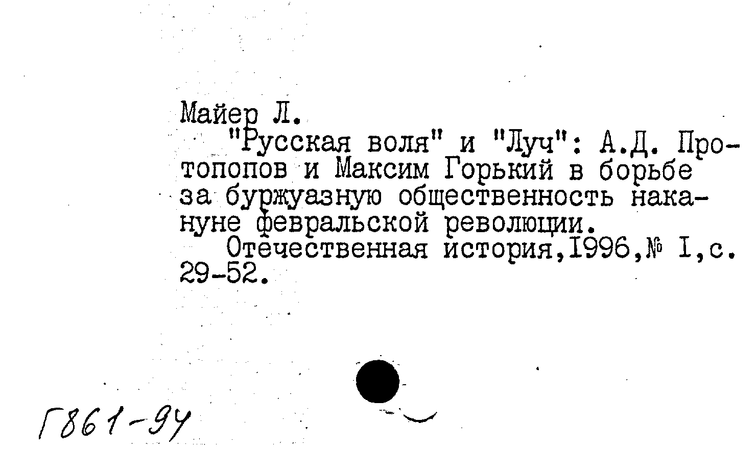 Статья: "Русская воля" и "Луч": А. Д. Протопопов и Максим Горький в борьбе за буржуазную общественность накануне февральской революции. Отечественная история, № 1 /1996: № 1 /1996