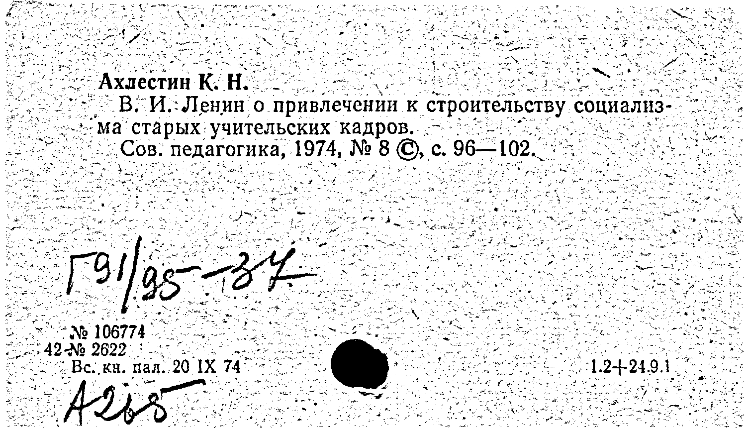 Статья: В. И. Ленин о привлечении к строительству социализма старых учительских кадров. Советская педагогика, N 8 1974: N 8 1974