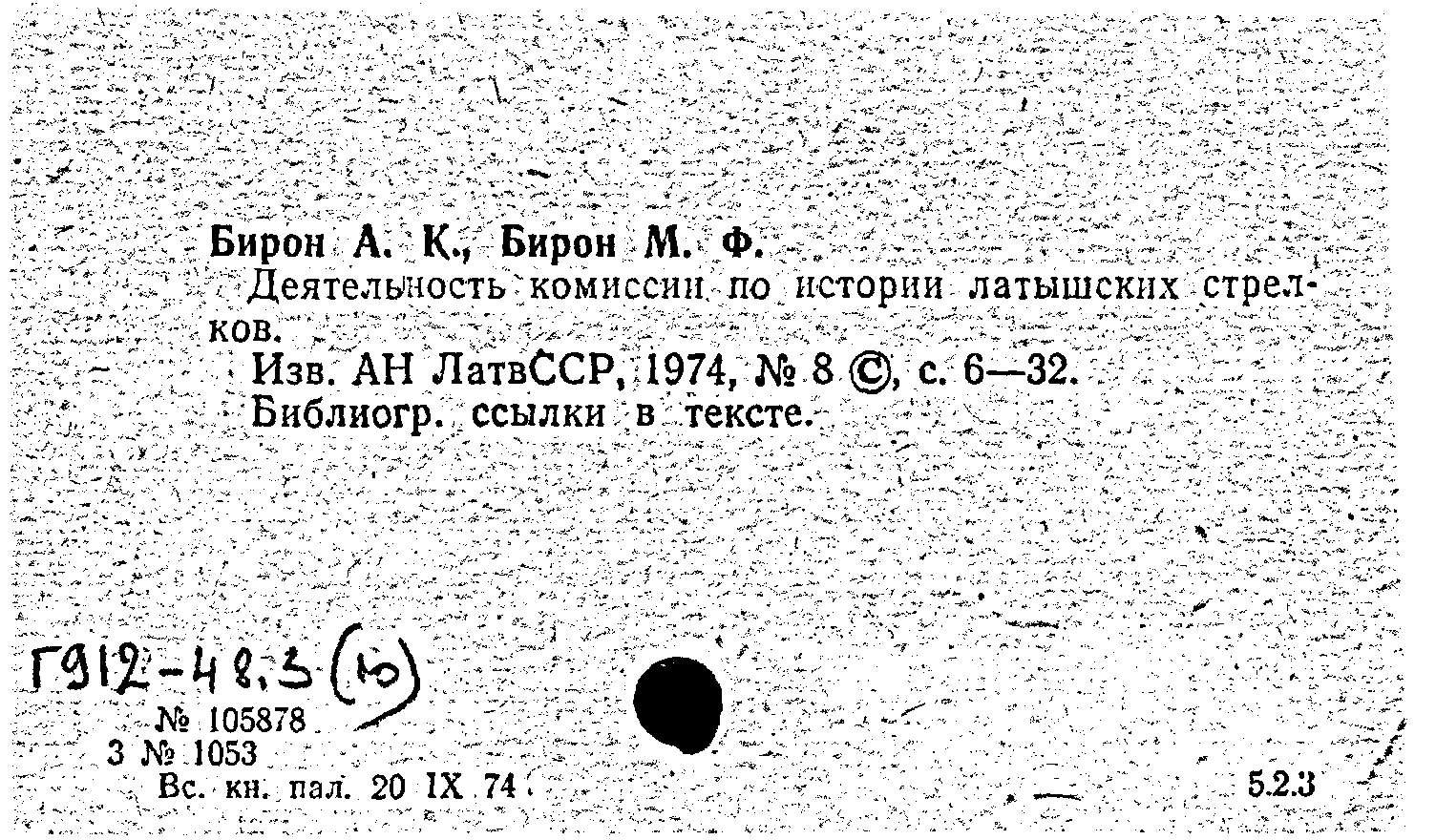 Деятельность комиссии по истории латышских стрелков. Известия Академии наук Латвийской ССР, N 8 1974: N 8 1974