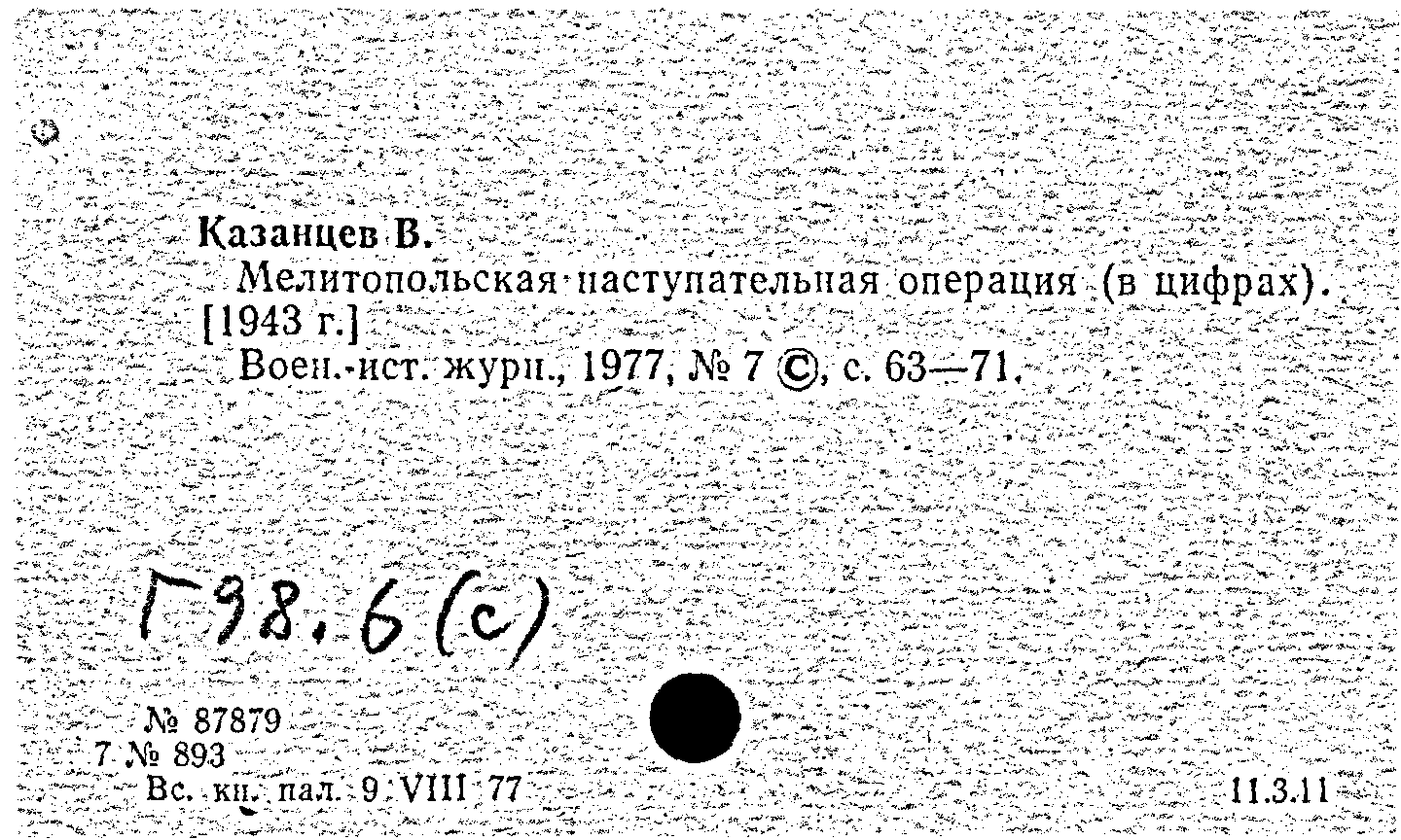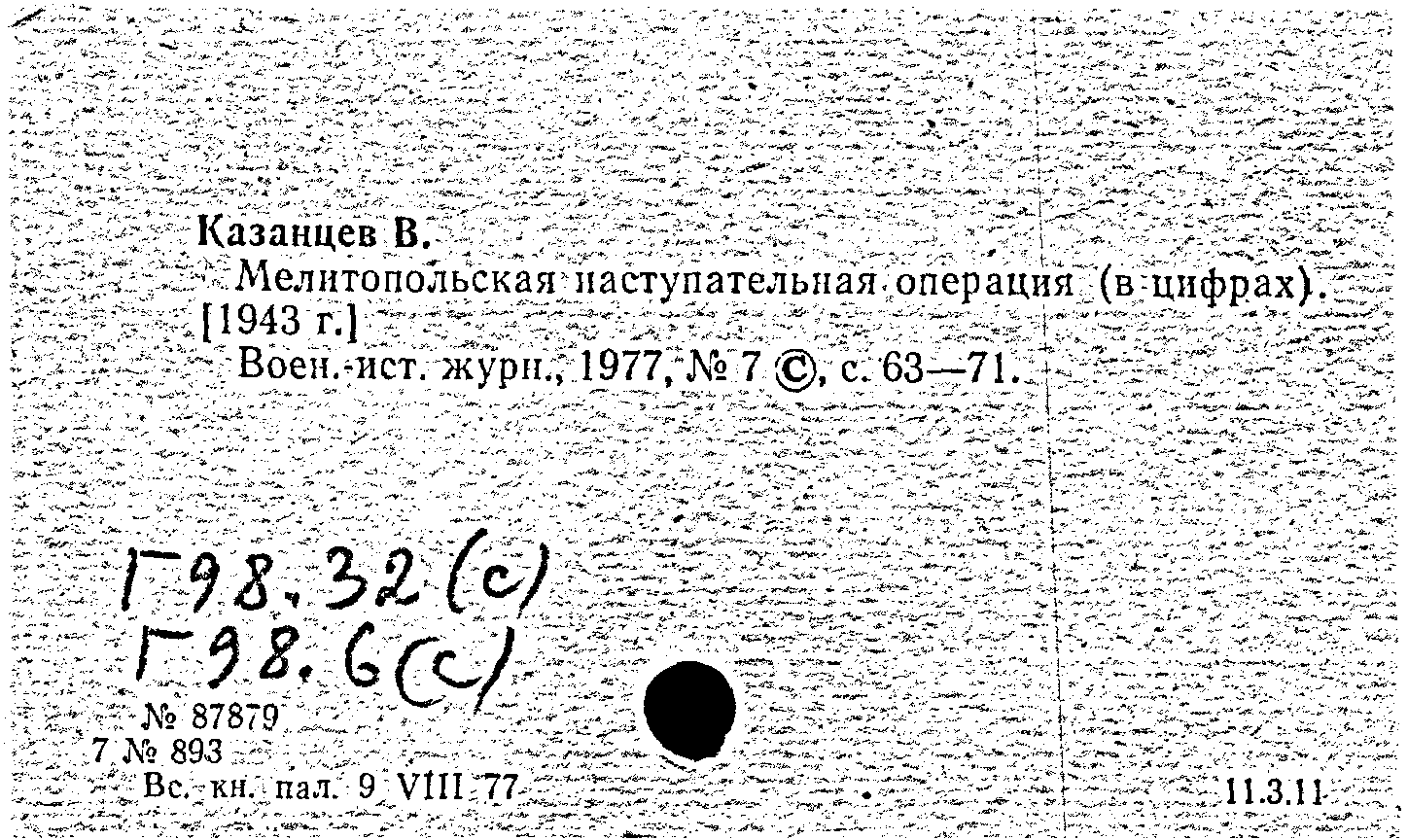 Мелитопольская наступательная операция (в цифрах). [1943 г.]. Военно-исторический журнал, N 7 1977: N 7 1977