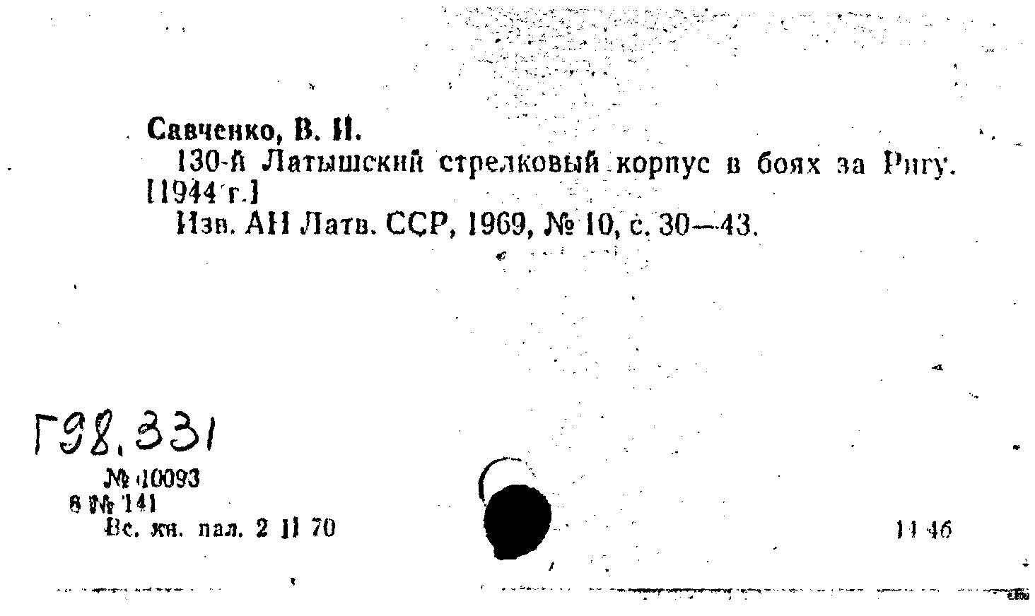Статья: 130-й Латышский стрелковый корпус в боях за Ригу. [1944 г.]. Известия Академии наук Латвийской ССР, N 10 1969: N 10 1969