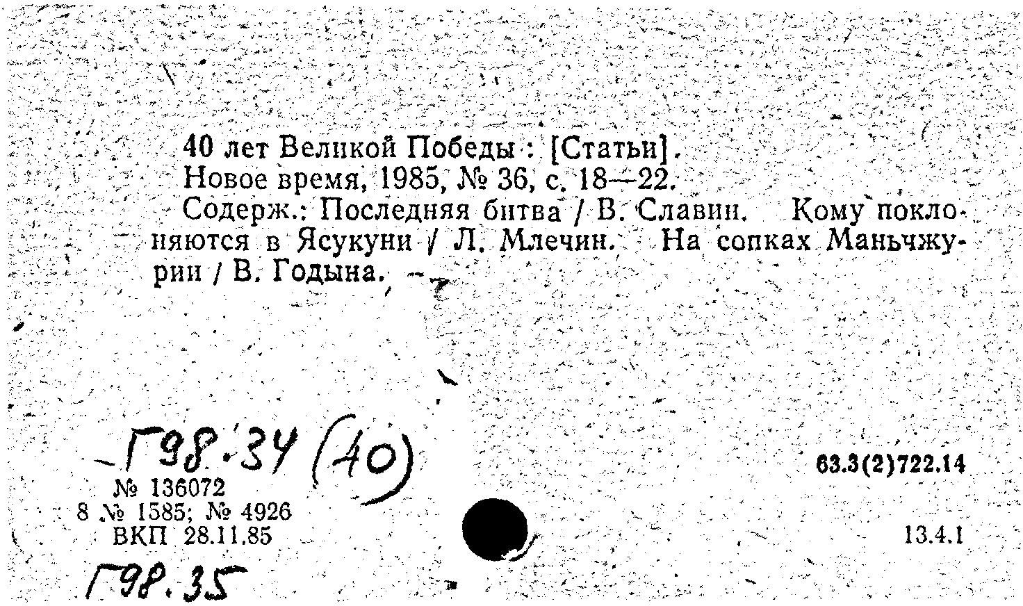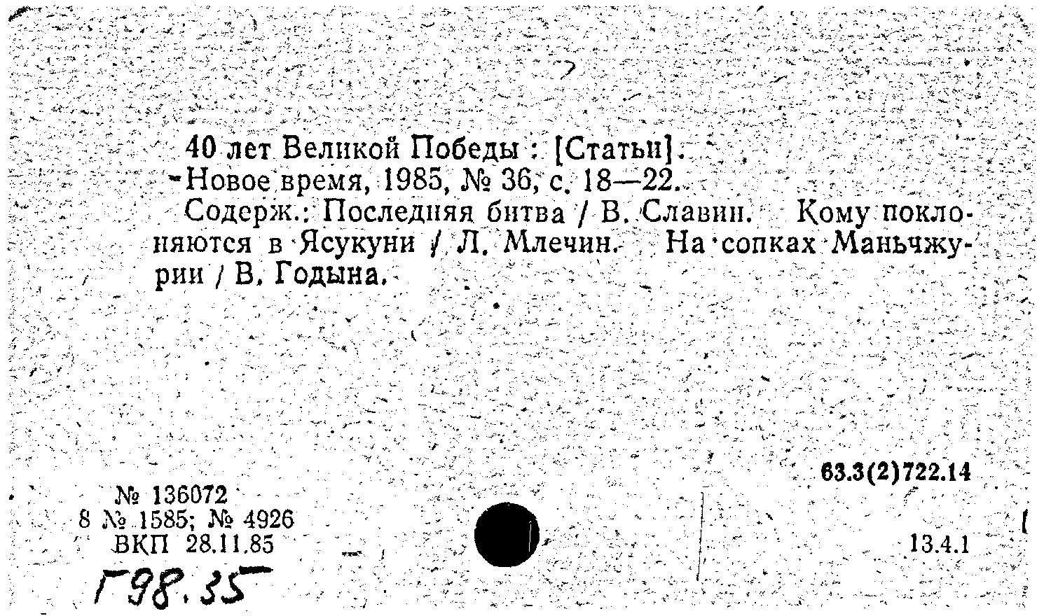 Статья: 40 лет Великой Победы. Новое время, N 36 1985: N 36 1985