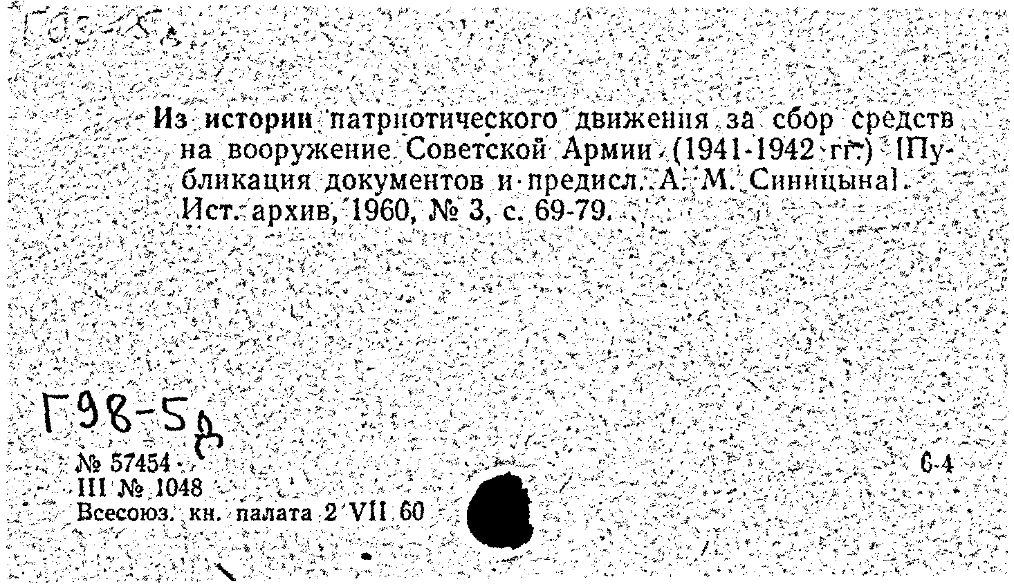 Статья: Из истории патриотического движения за сбор средств на вооружение Советской Армии (1941-1942 гг.). Исторический архив, N 3 1960: N 3 1960