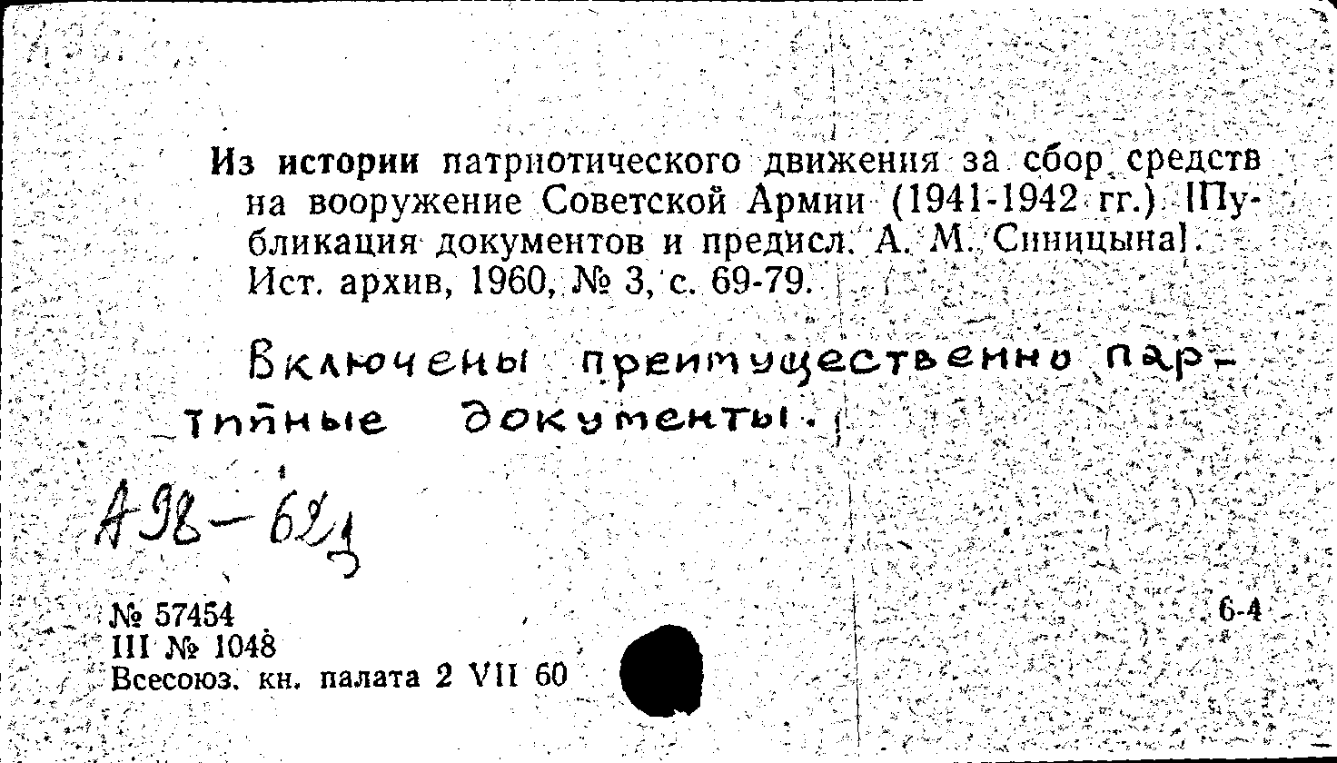 Из истории патриотического движения за сбор средств на вооружение Советской Армии (1941-1942 гг.). Исторический архив, N 3 1960: N 3 1960